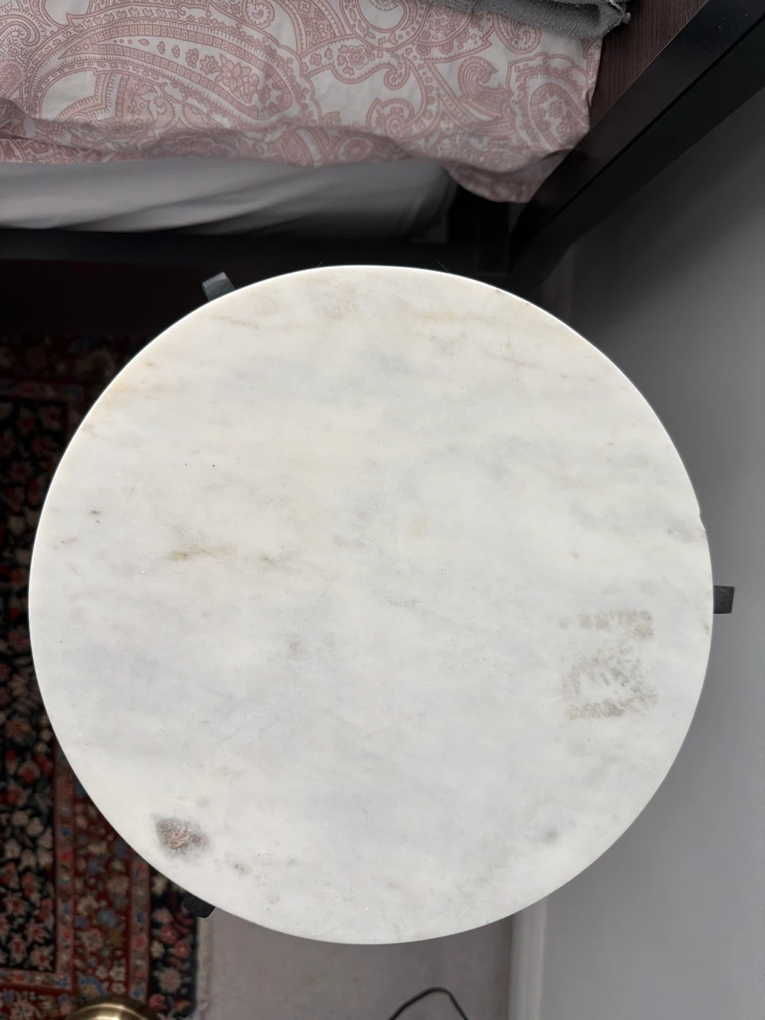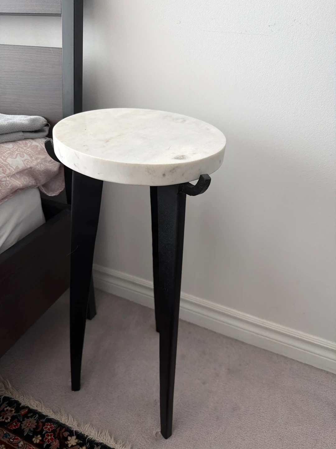 A stylish side table with a real marble top and black metal legs. It's perfect for holding a drink or a book next to a sofa or bed. Its compact size makes it handy for smaller spaces.