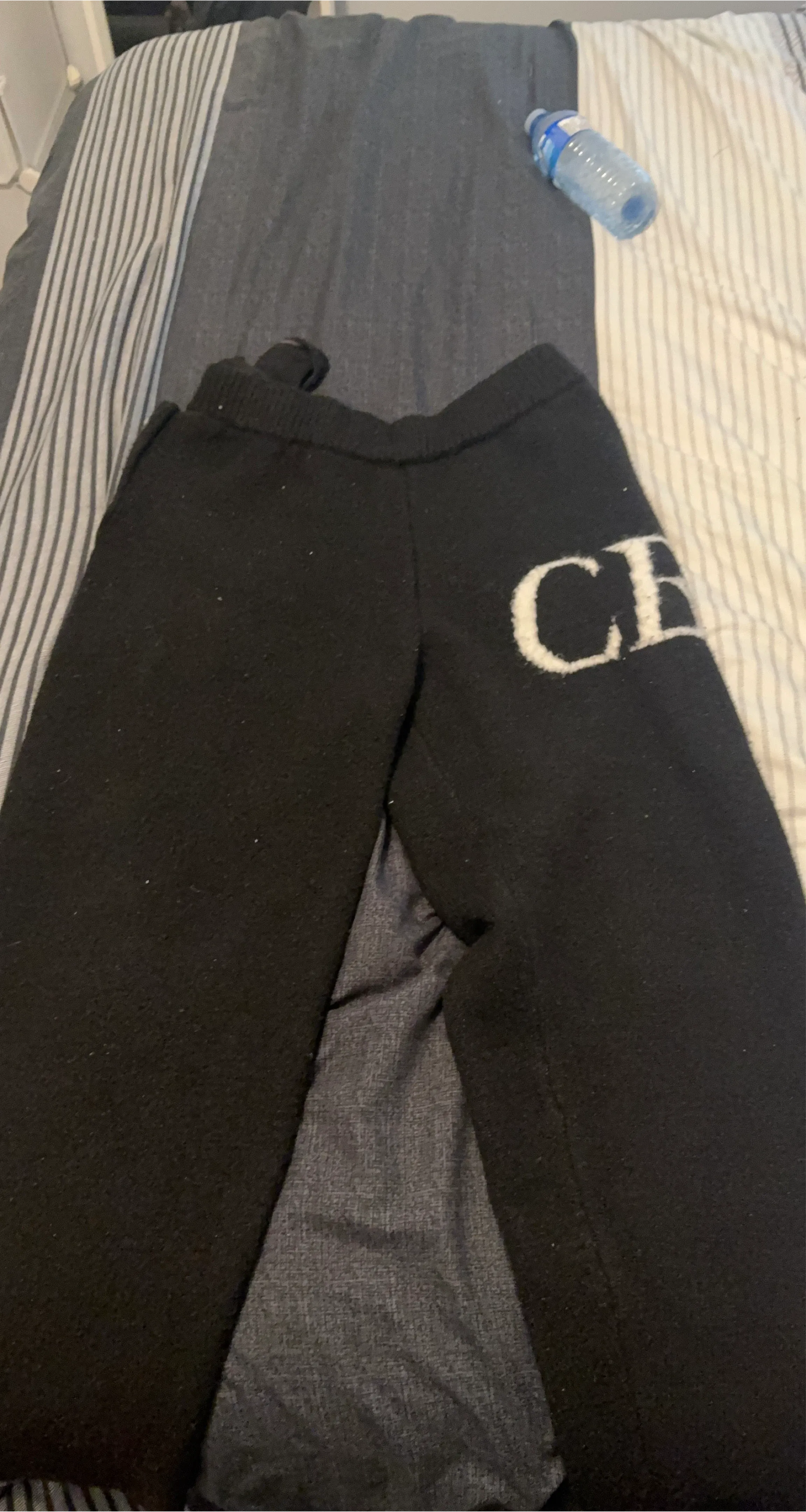 Selling a pair of black knit pants with 'CE' on the leg. They are in good condition and ready for a new owner!