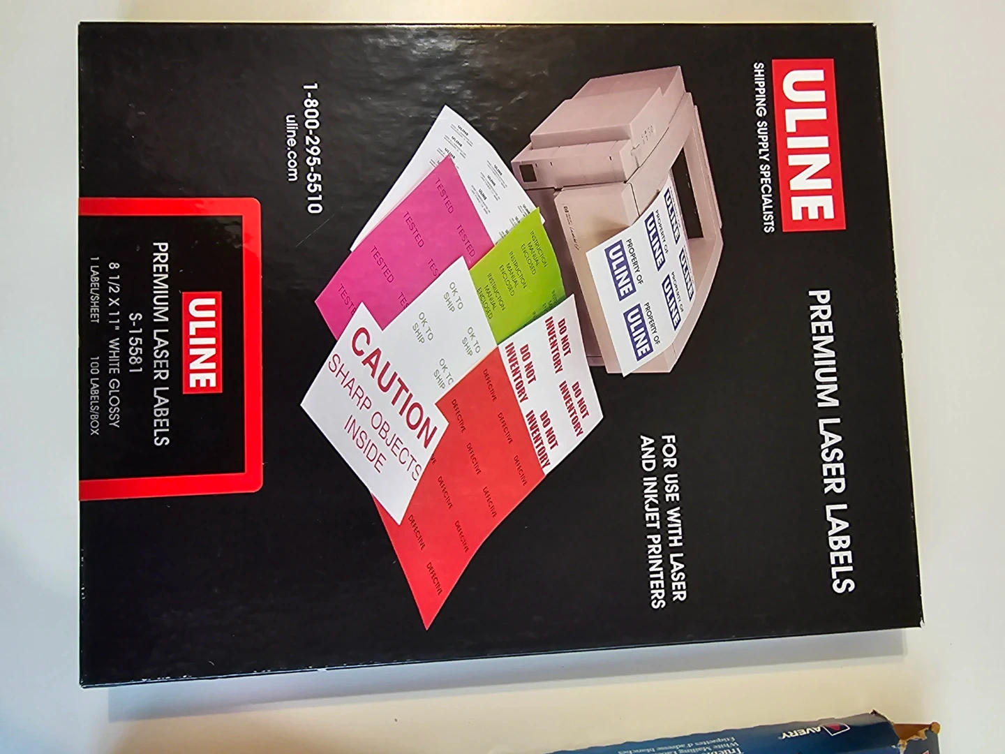 Box of Uline Premium Laser Labels for use with laser and inkjet printers. Each sheet contains 1 label, and there are 100 labels per box. These are 8 1/2" x 11" white glossy labels. They're ideal for shipping and general office use.