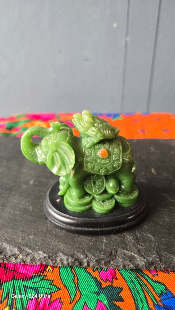 This is a lovely green jade figurine featuring an elephant with a toad on its back. It sits on a small black stand. A unique decorative piece for your home!
