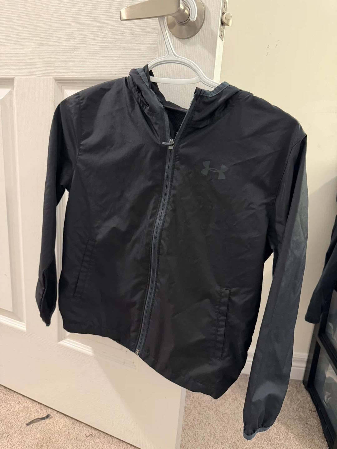 This is an very good Under Armour hooded windbreaker jacket. It's black with a full zip closure. Made from lightweight material, it's perfect for summerr windy days.