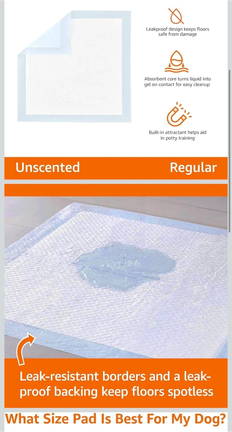 These regular size pee pads are 22 x 22 inches and come in a 50 count box. They feature a quick-dry, 5-layer super absorbent design for leak-proof protection. The absorbent core turns liquid into gel on contact for easy cleanup. Built-in attractant aids in potty training.