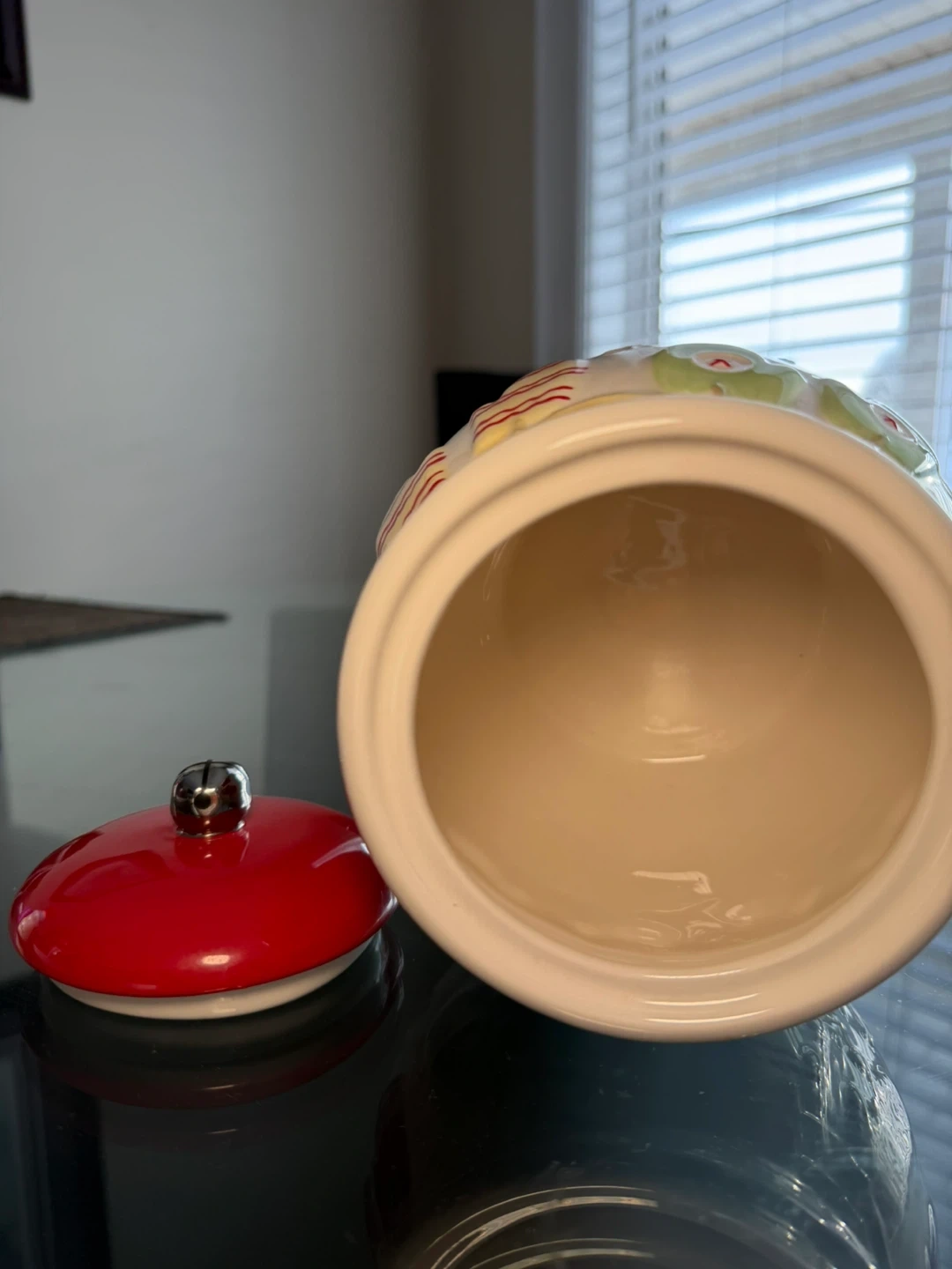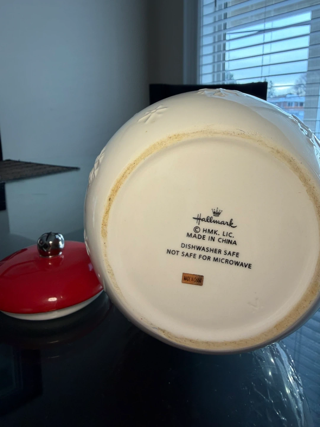 This Hallmark ceramic cookie jar features a festive design with mittens and snowflakes. It's dishwasher safe. This jar is great for storing holiday treats!
