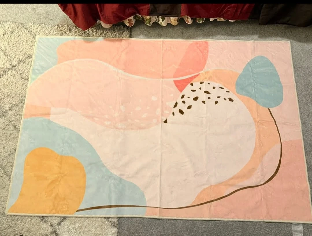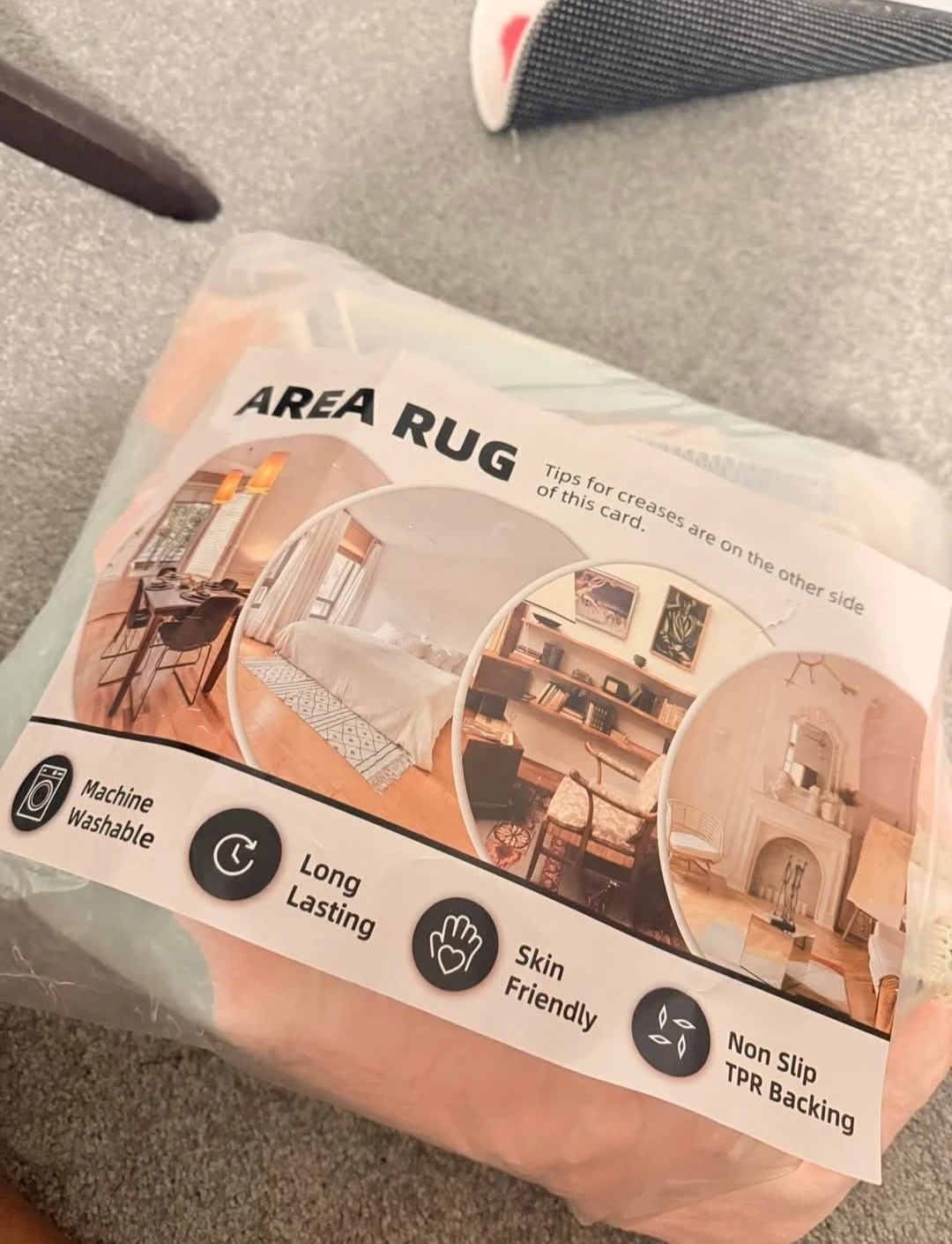Machine washable area rug. It's long-lasting, skin-friendly, and has a non-slip TPR backing. Offers tips for creases on the other side of the card. This rug would be useful for adding comfort and style to any room.