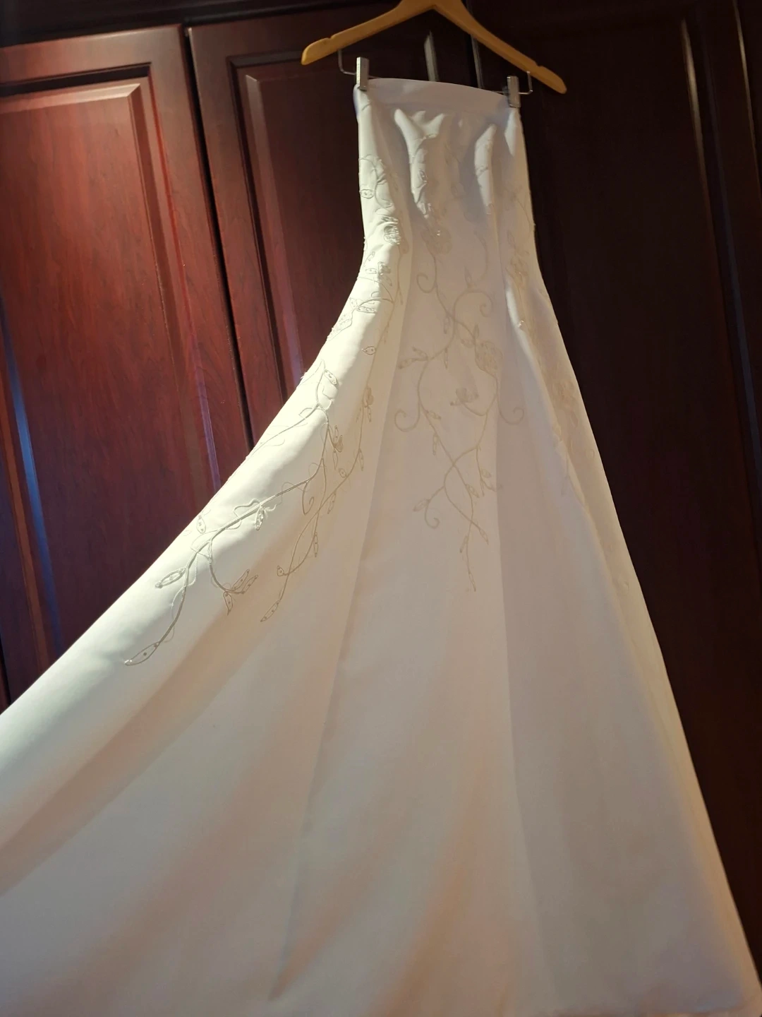 Beautiful white strapless wedding dress with intricate beadwork and floral embroidery. Comes with a matching sheer veil and a delicate pearl-accented tiara. Buttons up the back of the dress. Height 5'4"