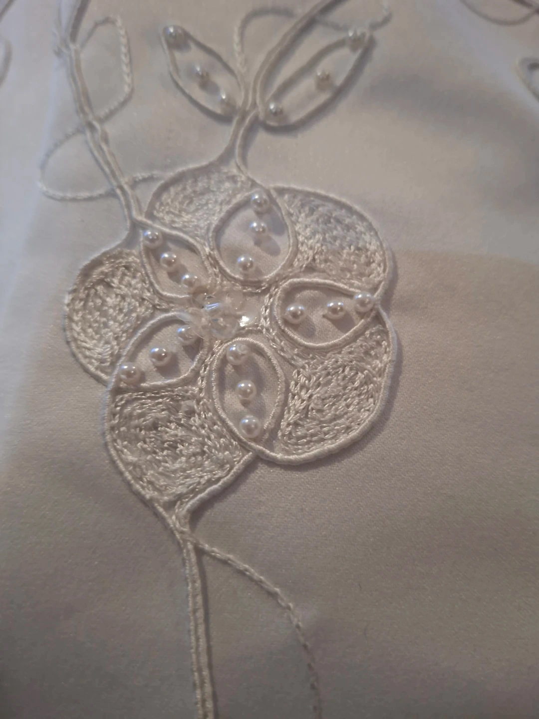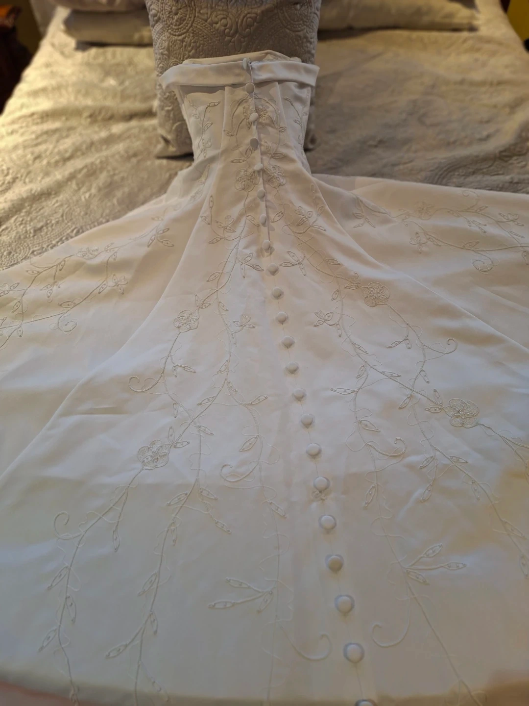 Beautiful white strapless wedding dress with intricate beadwork and floral embroidery. Comes with a matching sheer veil and a delicate pearl-accented tiara. Buttons up the back of the dress. Height 5'4"