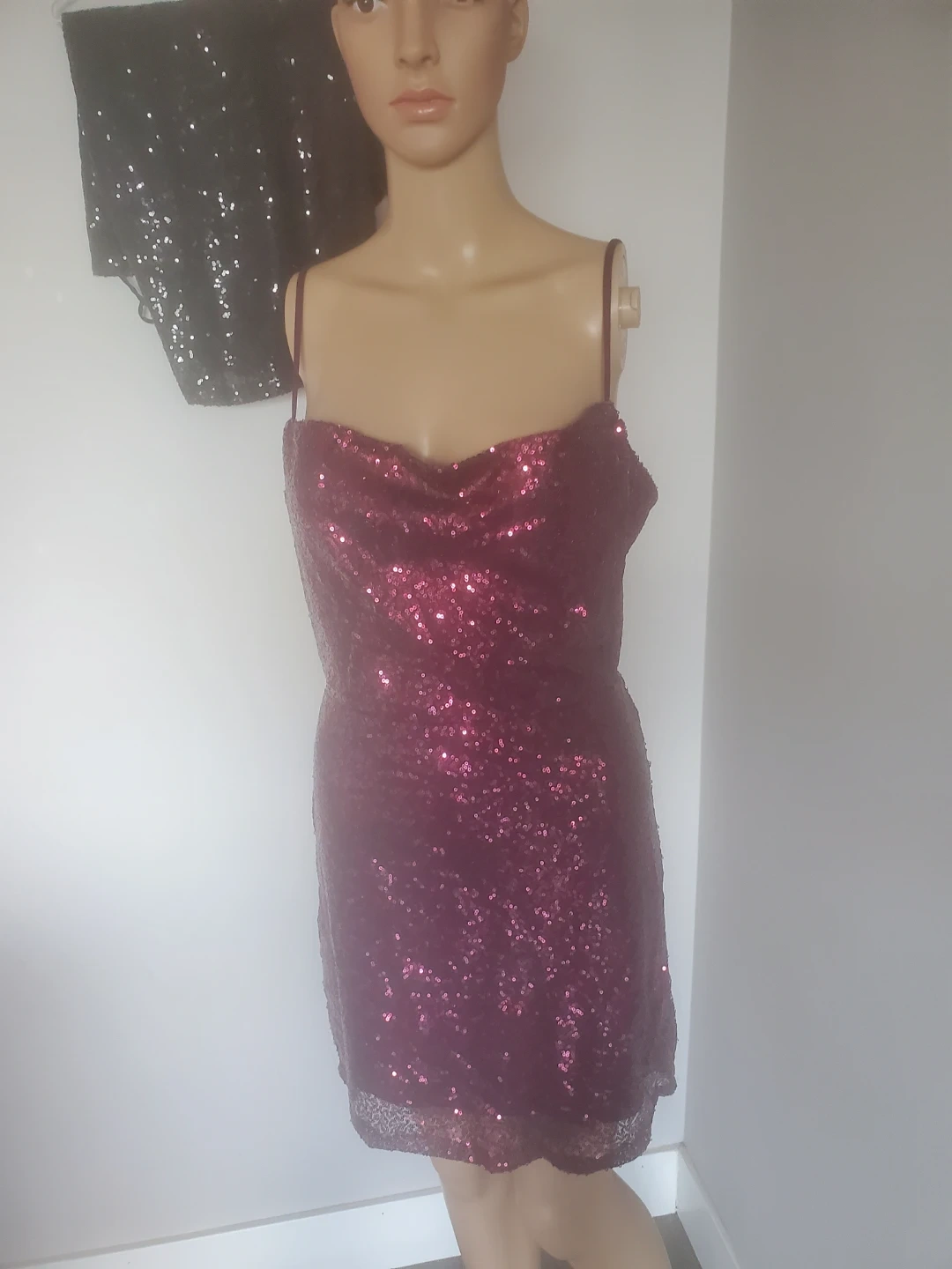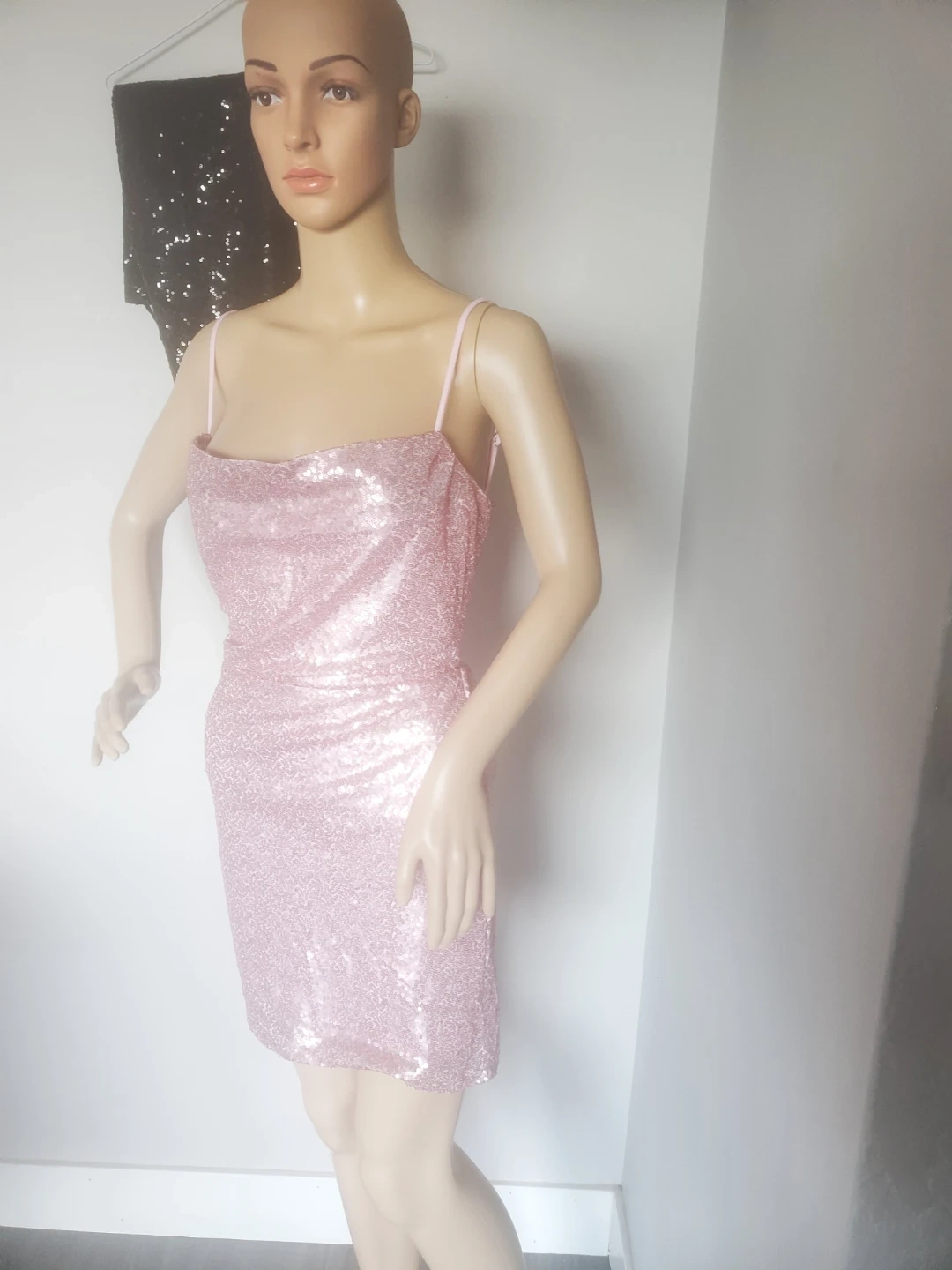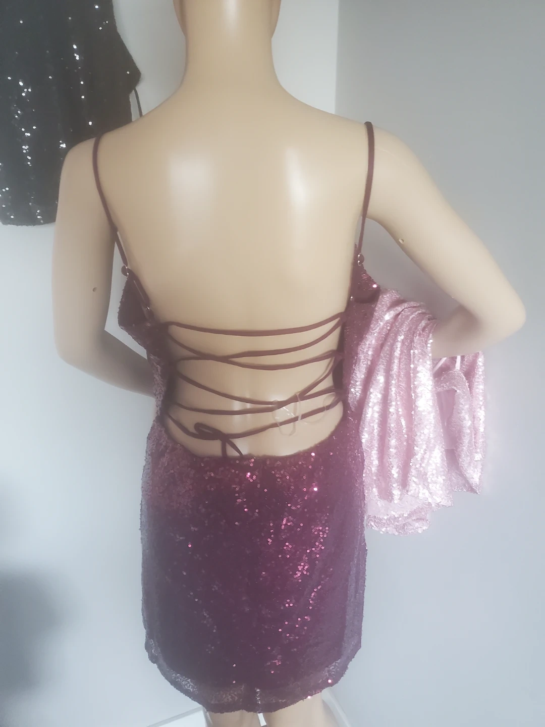 Selling a cute sequin mini dress! It's a light pink colour and has a lace-up back. Perfect for a night out or a party!