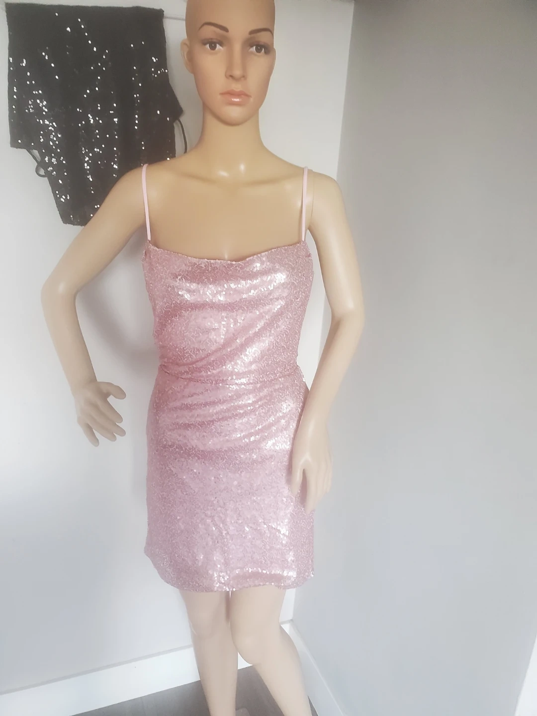 Selling a cute sequin mini dress! It's a light pink colour and has a lace-up back. Perfect for a night out or a party!