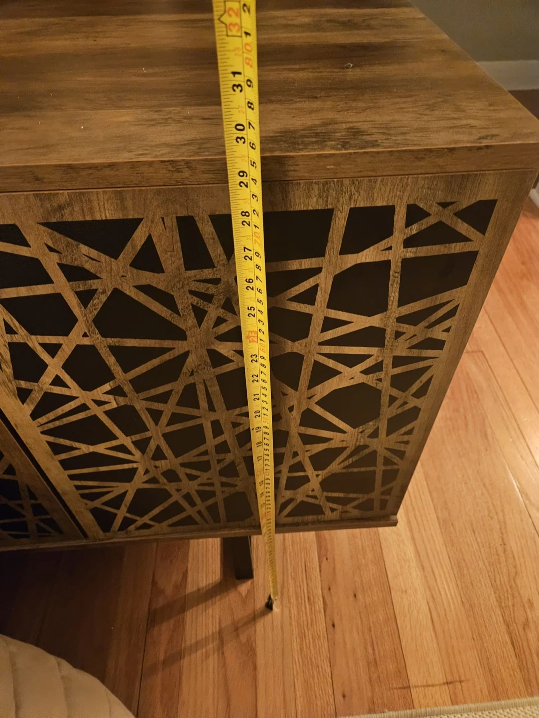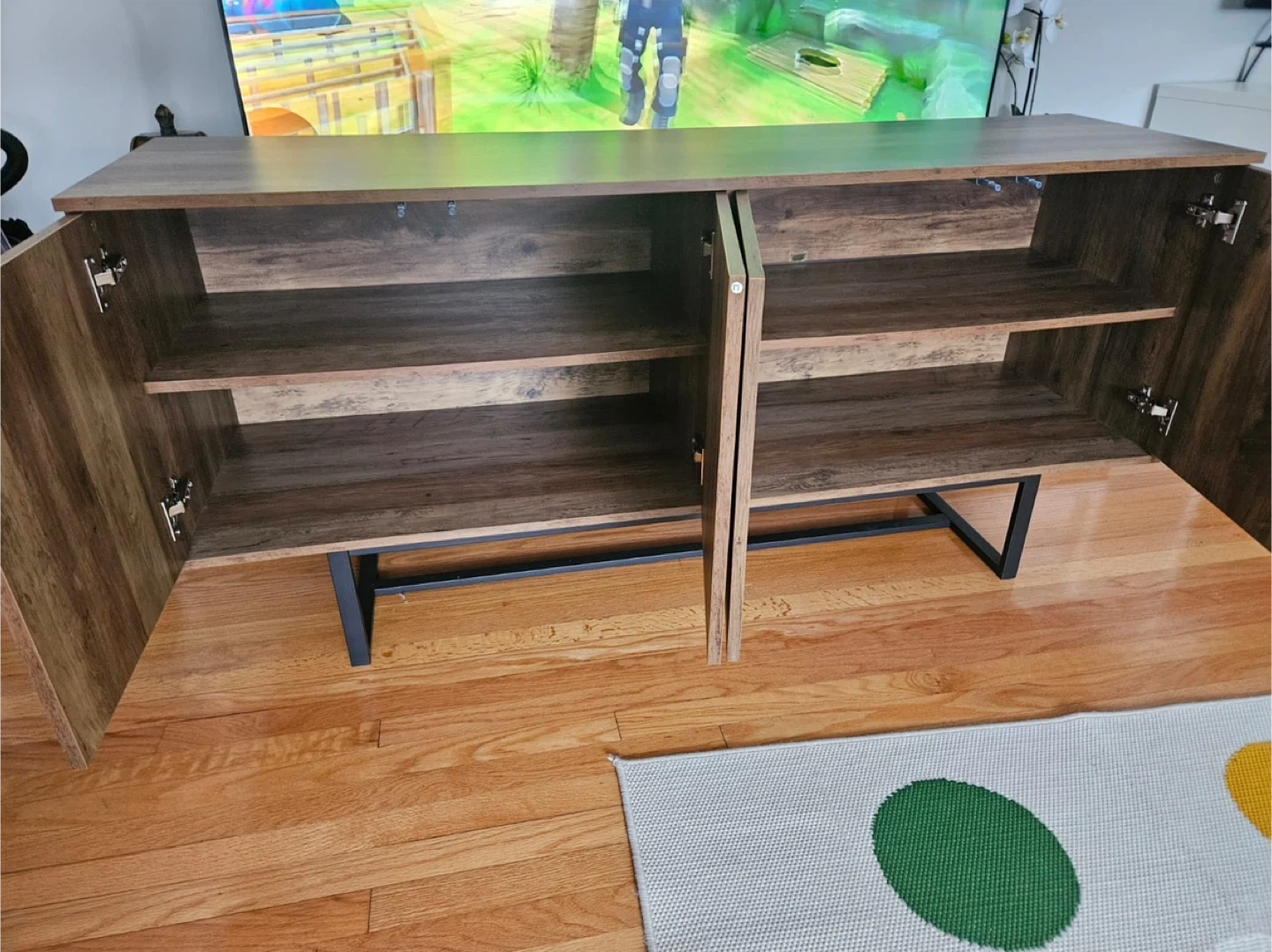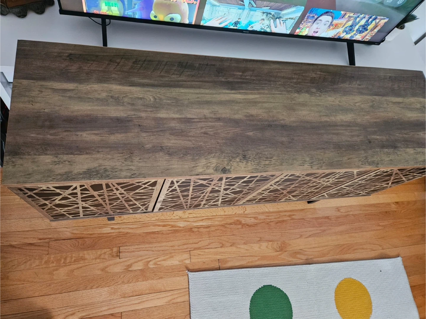 This media console offers a stylish storage solution. It features four doors with a unique geometric design. Inside, there are two shelving units for your electronics or decor.used new home delivery available