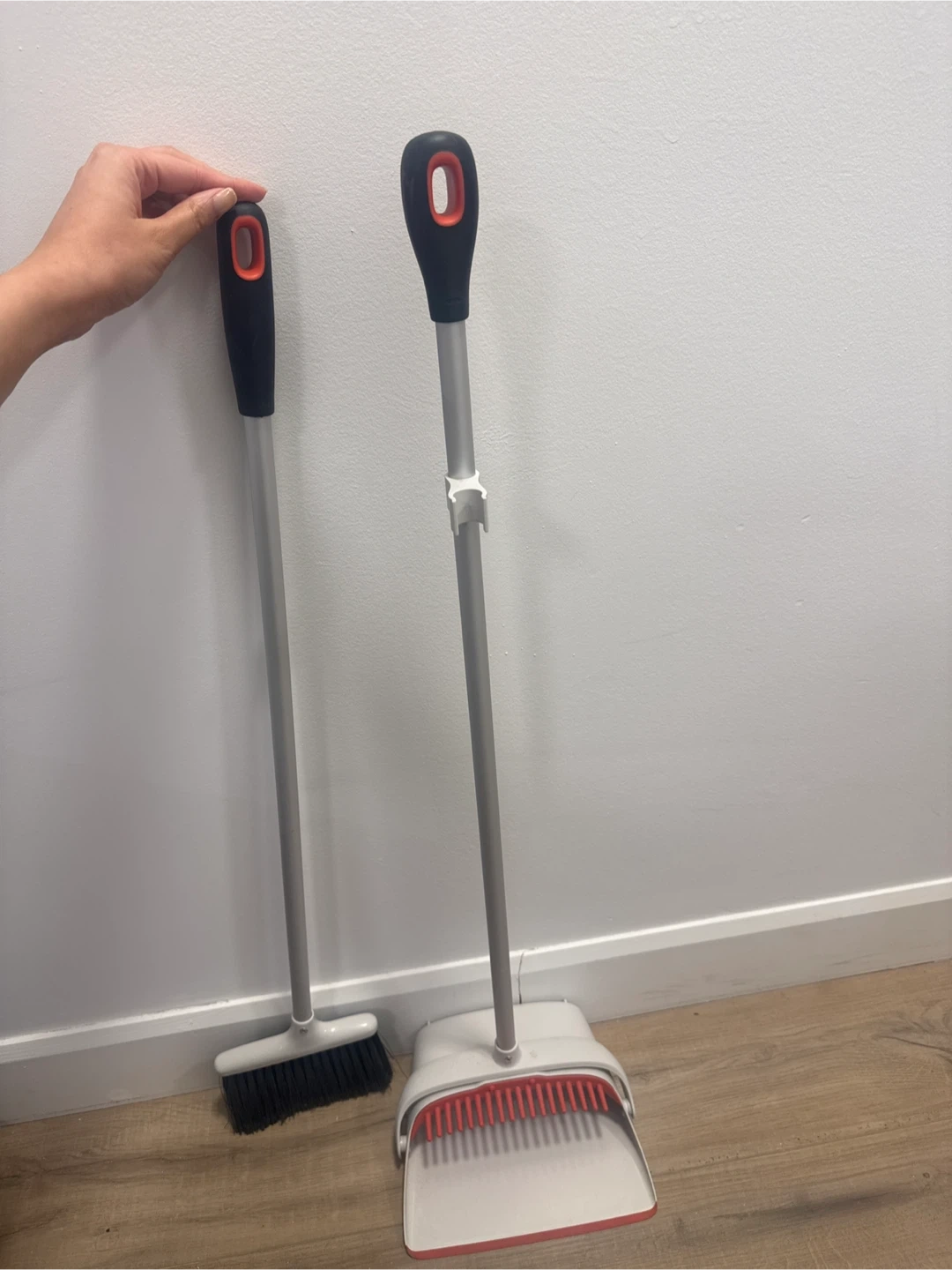 This is a broom and dustpan set with silver handles and black bristles. The dustpan is white with red trim and has a comb-like edge to clean the broom. It's designed for efficient sweeping.