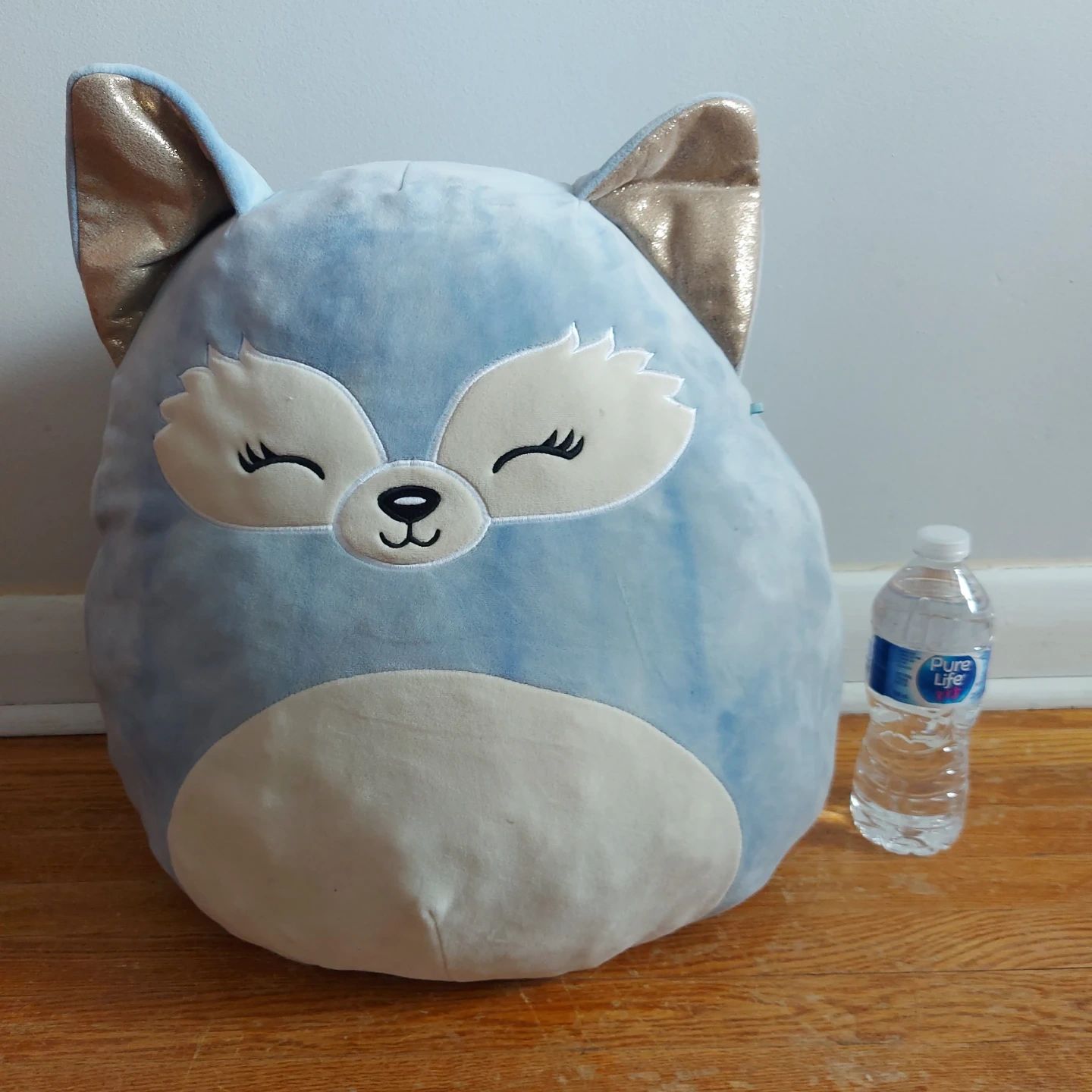 This is a Squishmallows blue fox plush toy, perfect for kids who love cuddly companions! This plush is in used good condition. It's super soft and squishy, making it ideal for snuggling. It has cute sleepy eyes, golden ears and a tail. It's in great shape and ready for a new home!
