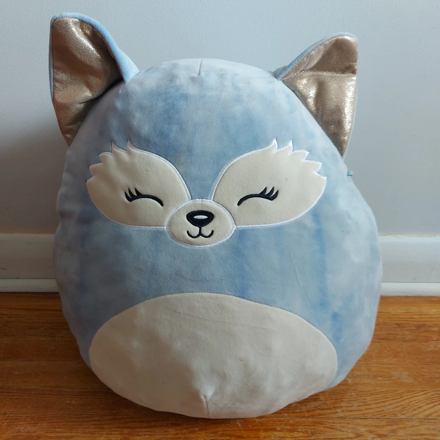 This is a Squishmallows blue fox plush toy, perfect for kids who love cuddly companions! This plush is in used good condition. It's super soft and squishy, making it ideal for snuggling. It has cute sleepy eyes, golden ears and a tail. It's in great shape and ready for a new home!