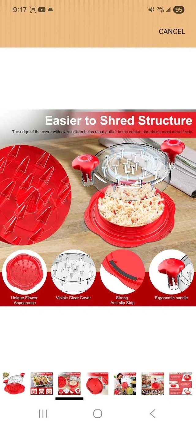 This is a new, unused meat shredder perfect for easily pulling pork, chicken, and beef at home. It features a unique flower appearance, a visible clear cover, a strong anti-slip strip, and an ergonomic handle. Looking for an easy way to shred meat for tacos, salads, or sandwiches? This meat shredder is the perfect solution! If you see this ad, it's still available.