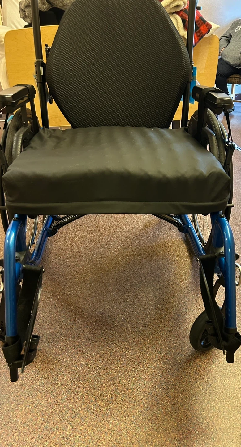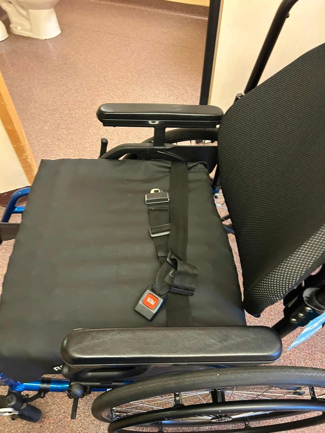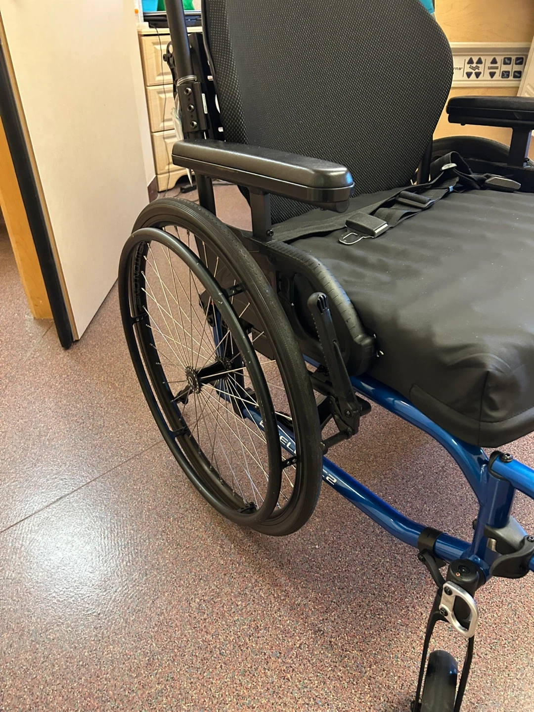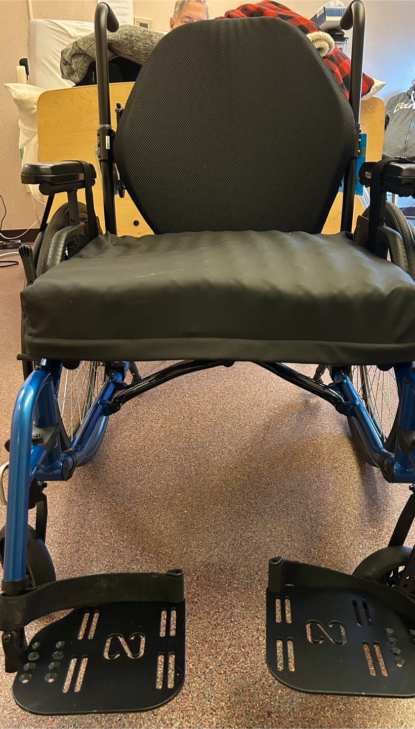 Ki Mobility Catalyst 5x wheelchair with a blue frame. It features a black seat cushion and a padded backrest. Includes armrests and footrests. A safety belt is attached to the seat. Selling for my dad as he now has a powered one. Adjustable back and seat. Wheels come off for easy transporting, and seat belt. Seat is 20”x20” roho cushion. Can deliver within Hamilton/Burlington. Open to offers