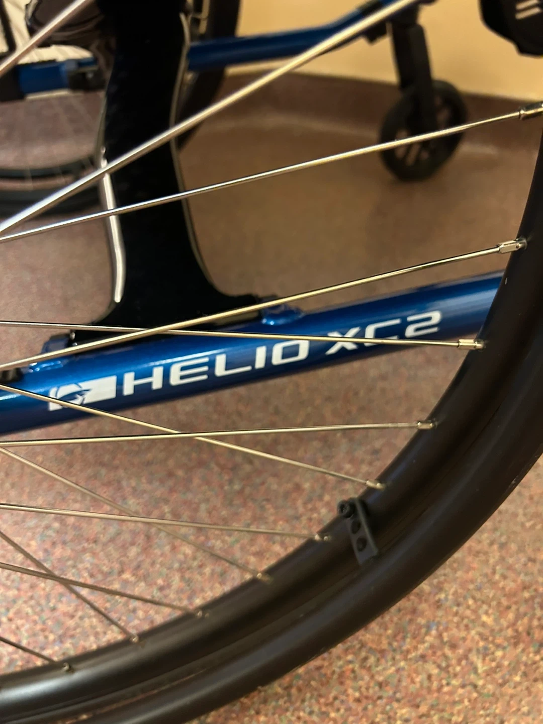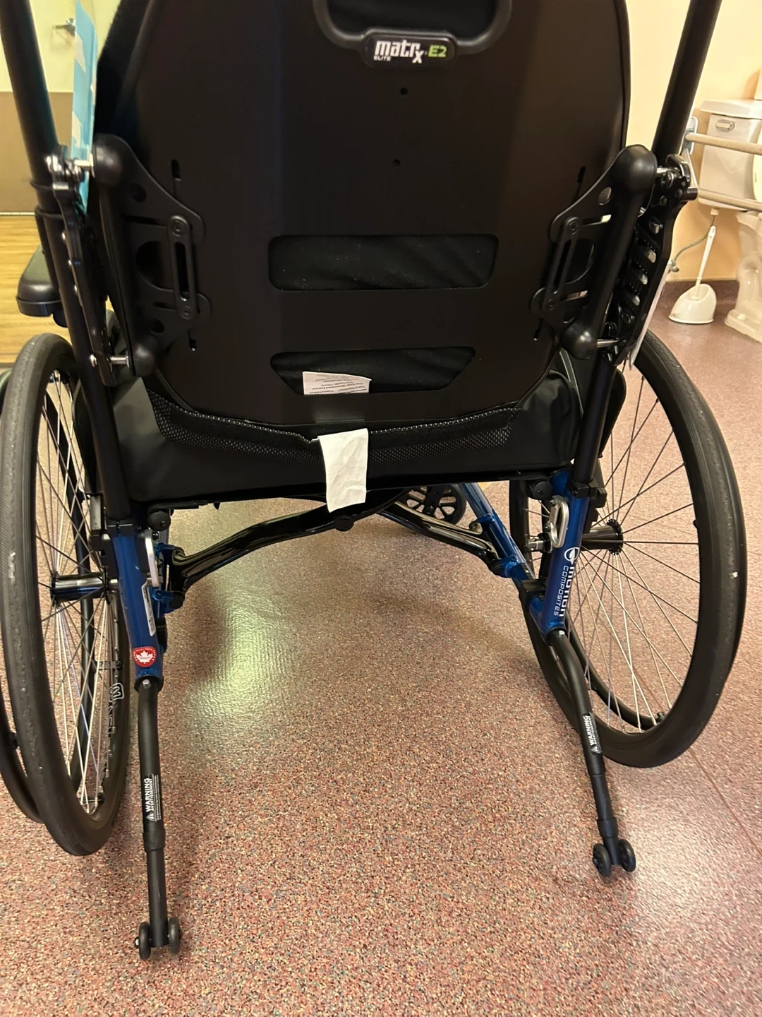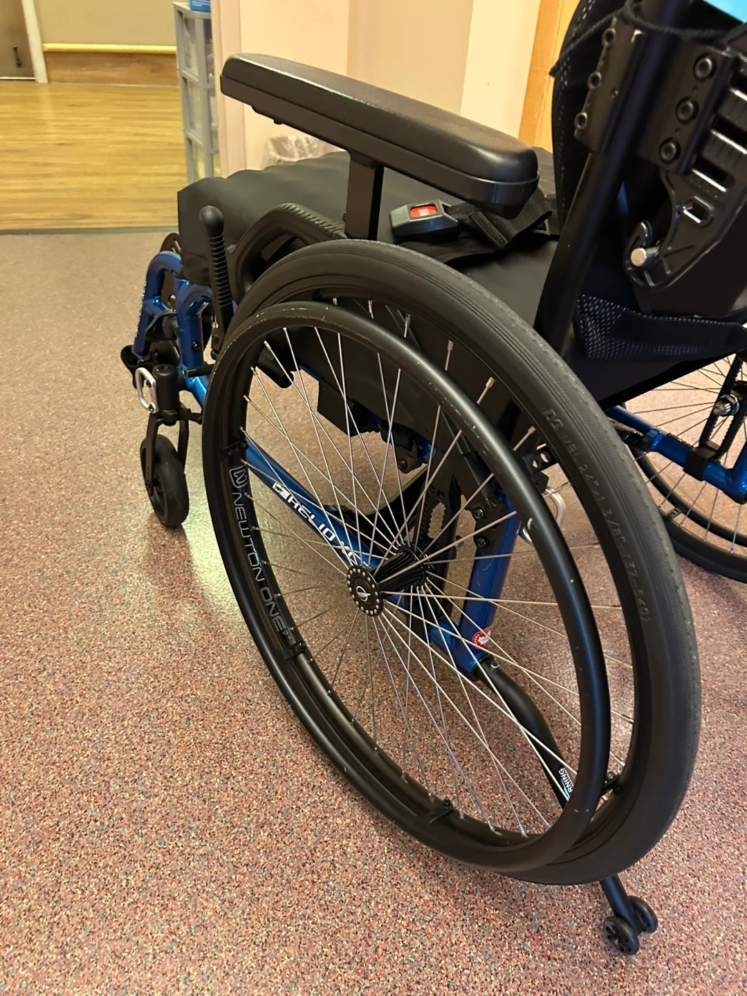 Ki Mobility Catalyst 5x wheelchair with a blue frame. It features a black seat cushion and a padded backrest. Includes armrests and footrests. A safety belt is attached to the seat. Selling for my dad as he now has a powered one. Adjustable back and seat. Wheels come off for easy transporting, and seat belt. Seat is 20”x20” roho cushion. Can deliver within Hamilton/Burlington. Open to offers