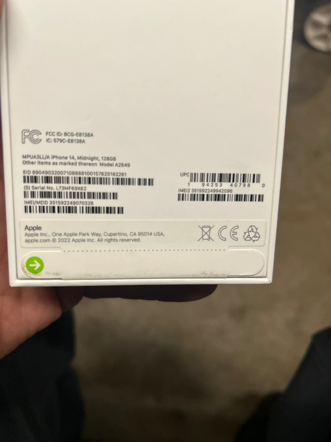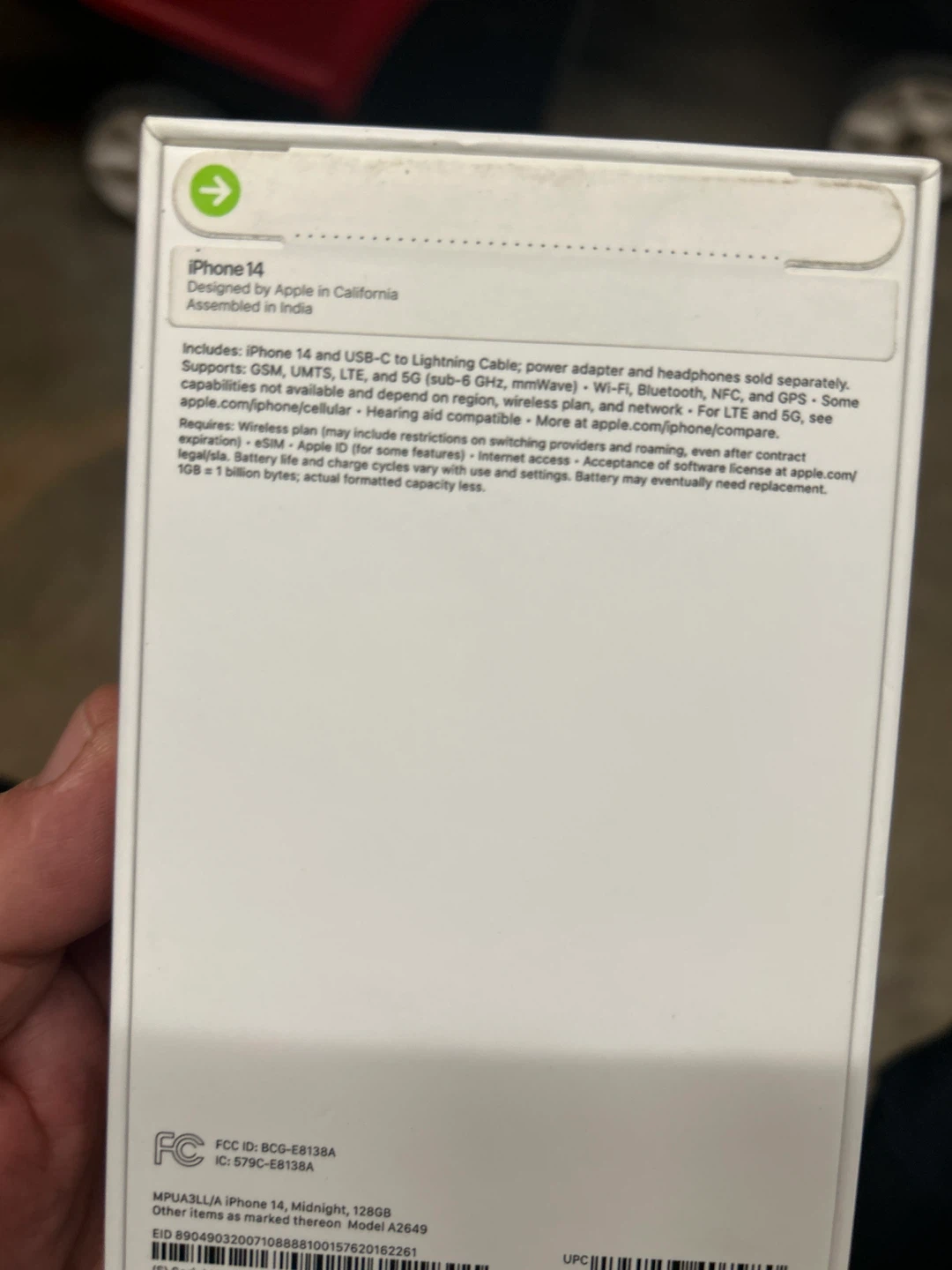 This is a new Apple iPhone 14 in Midnight color with 128GB storage. It includes the iPhone 14 and a USB-C to Lightning Cable. Wireless plan, power adapter, and headphones sold separately. Assembled in India.