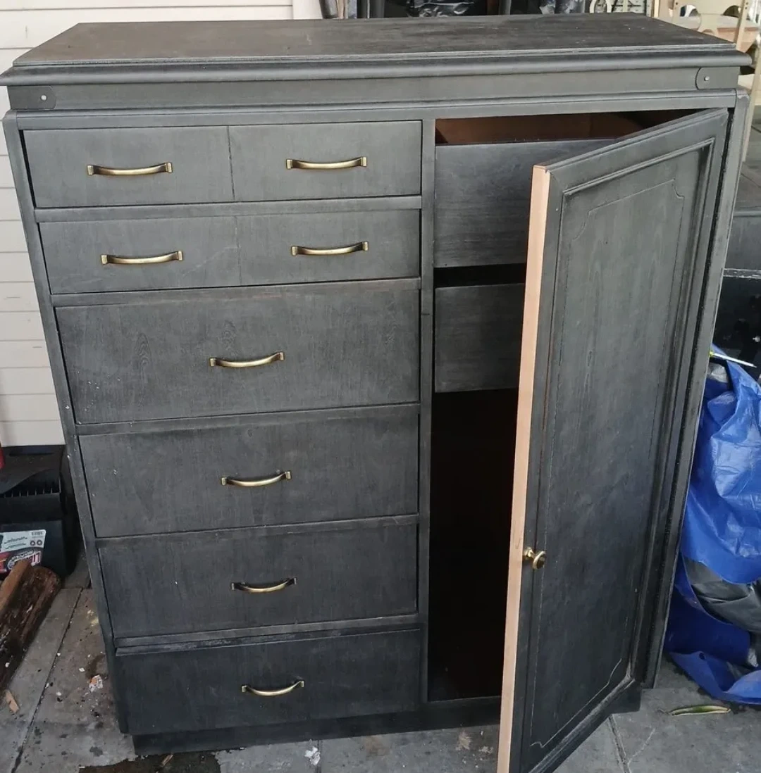This is a tall dresser with six drawers and a cabinet with a door with two more drawers inside. The dresser is finished in a dark grey colour with brass-toned hardware. It's made of solid wood.