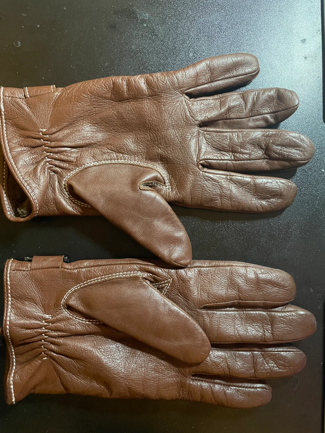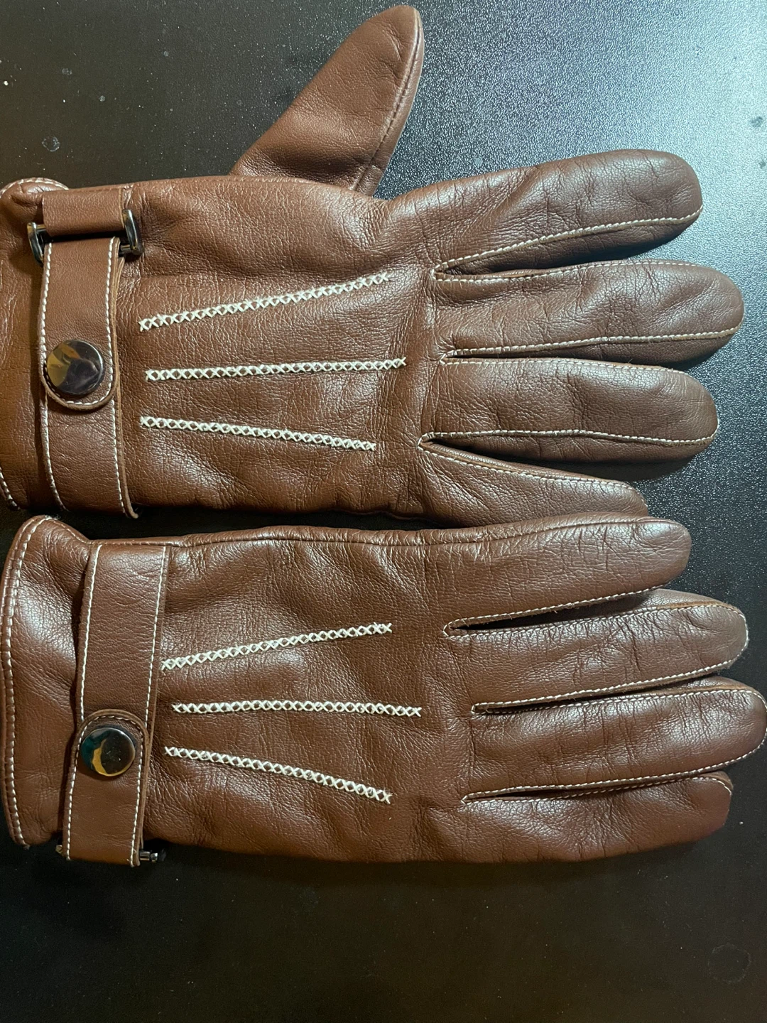 Selling a pair of brown leather gloves. They're in great condition and ready to keep your hands warm!