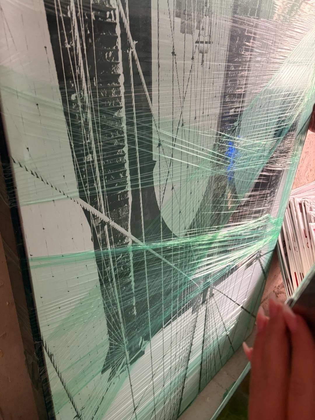 Large canvas art print featuring a black and white image of the Brooklyn Bridge. This piece is wrapped in protective plastic. It's ready to add some urban charm to your space! A great statement piece for any room.