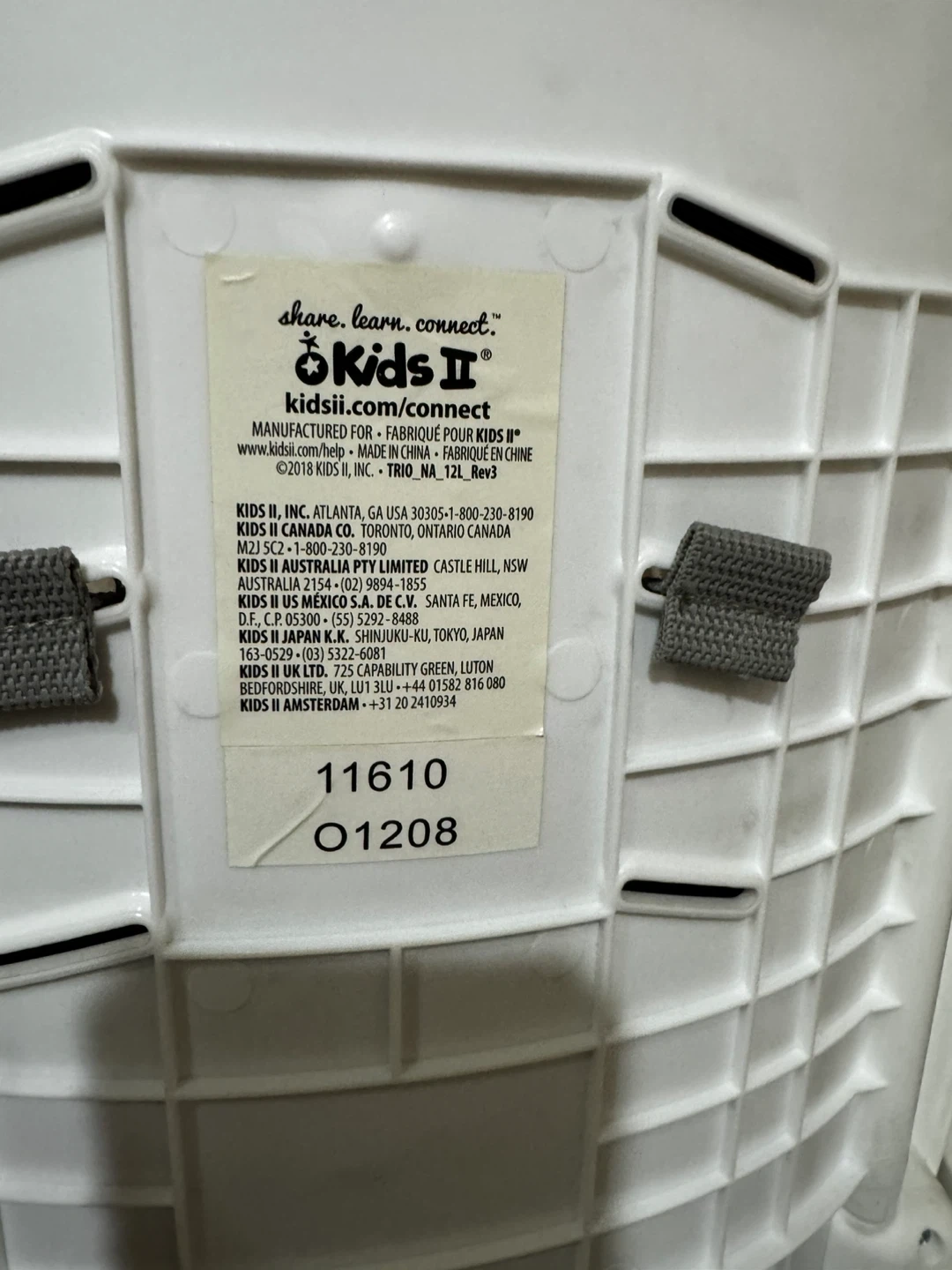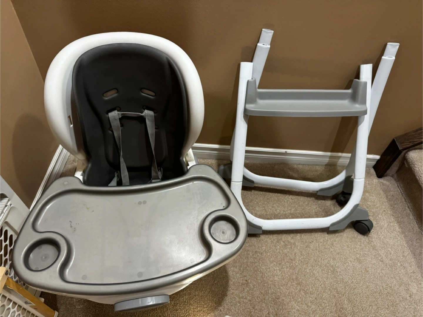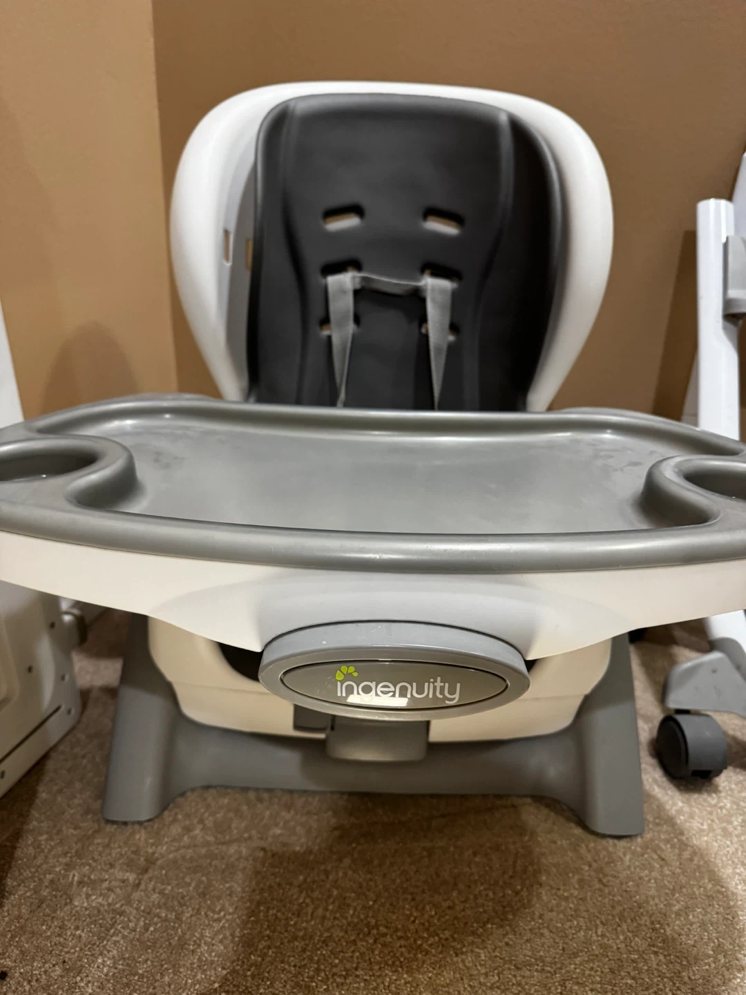This Ingenuity high chair booster seat is white and grey. It easily converts to a toddler chair. It's suitable for mealtimes and feeding. This chair is great for little ones learning to eat safely.