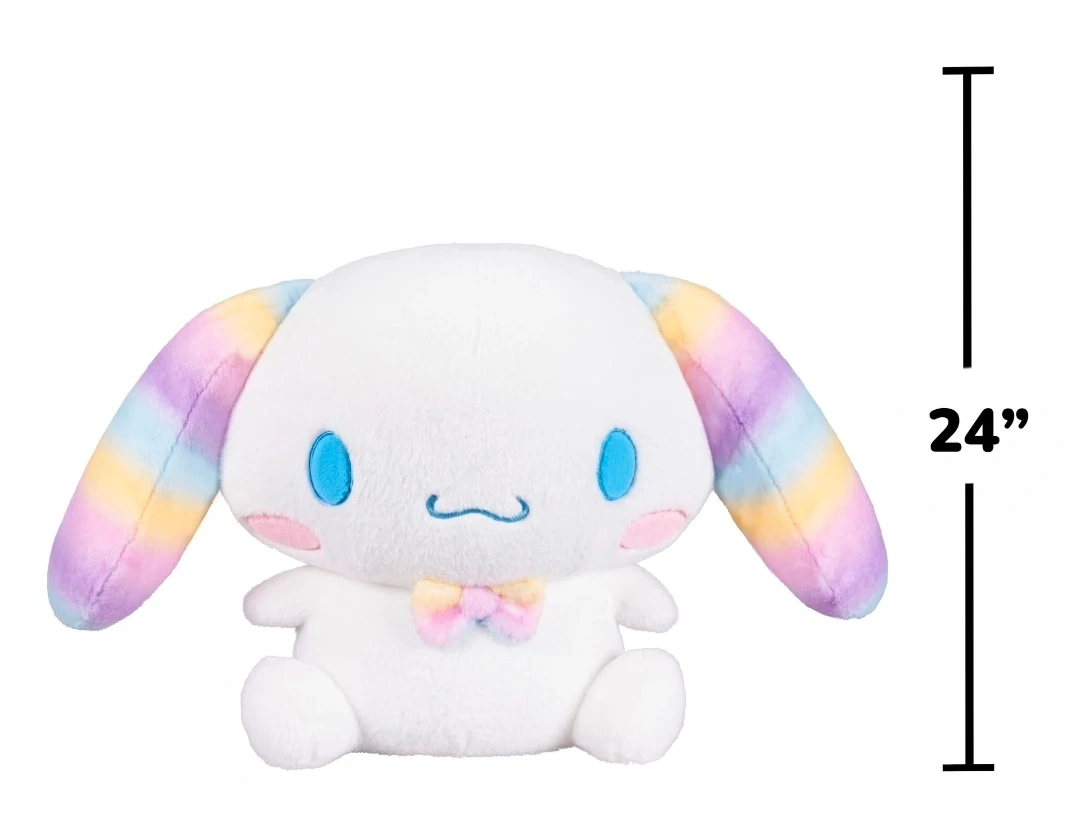 This is a 24-inch Cinnamoroll plush toy. It's white with pastel rainbow stripes on its ears. It has a colourful bow tie.