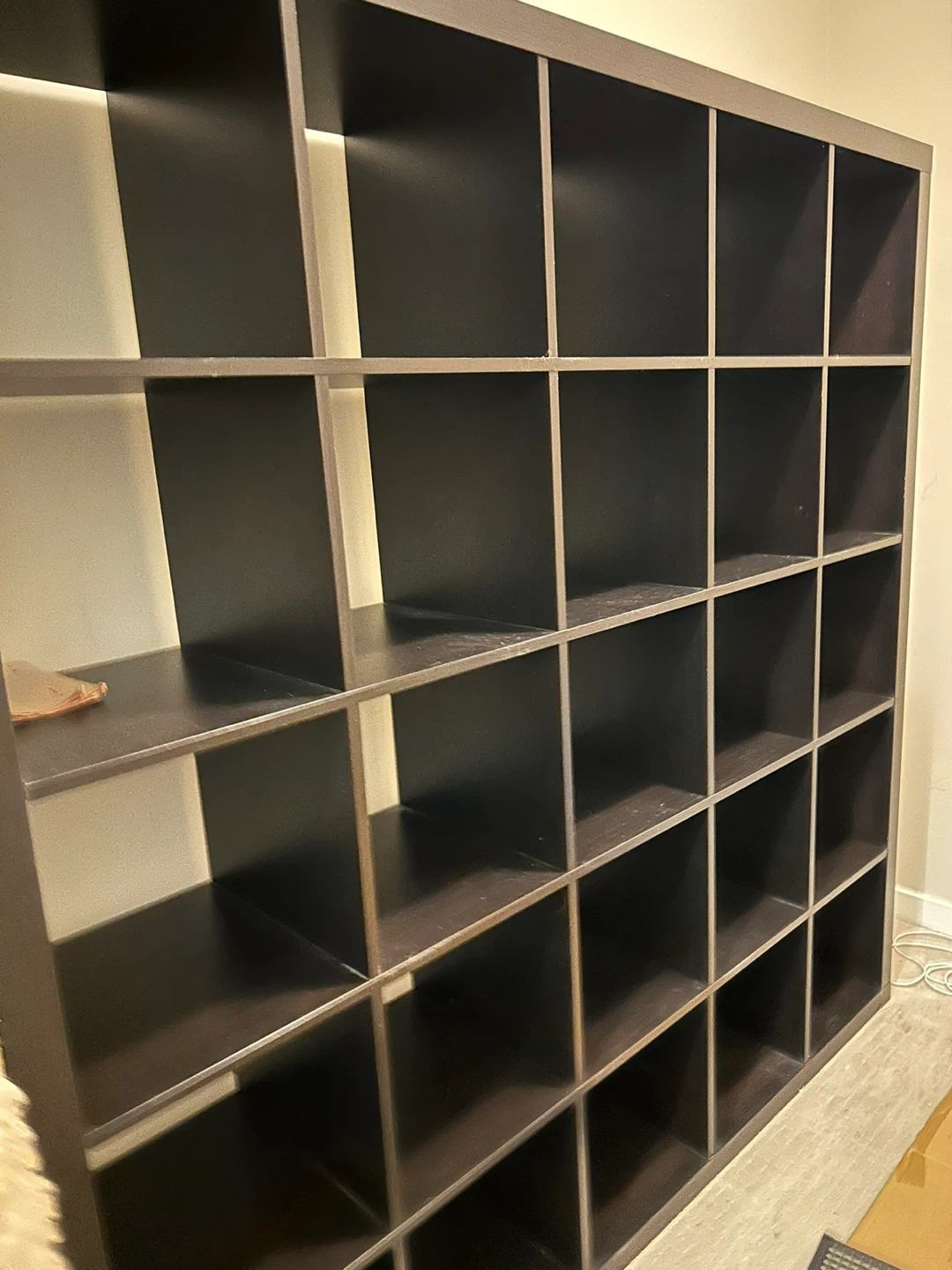 This is an IKEA EXPEDIT shelving unit. It's a large, heavy, modular storage system with 25 cube compartments. This unit provides ample space for books, decor, or any other items you need to organize.