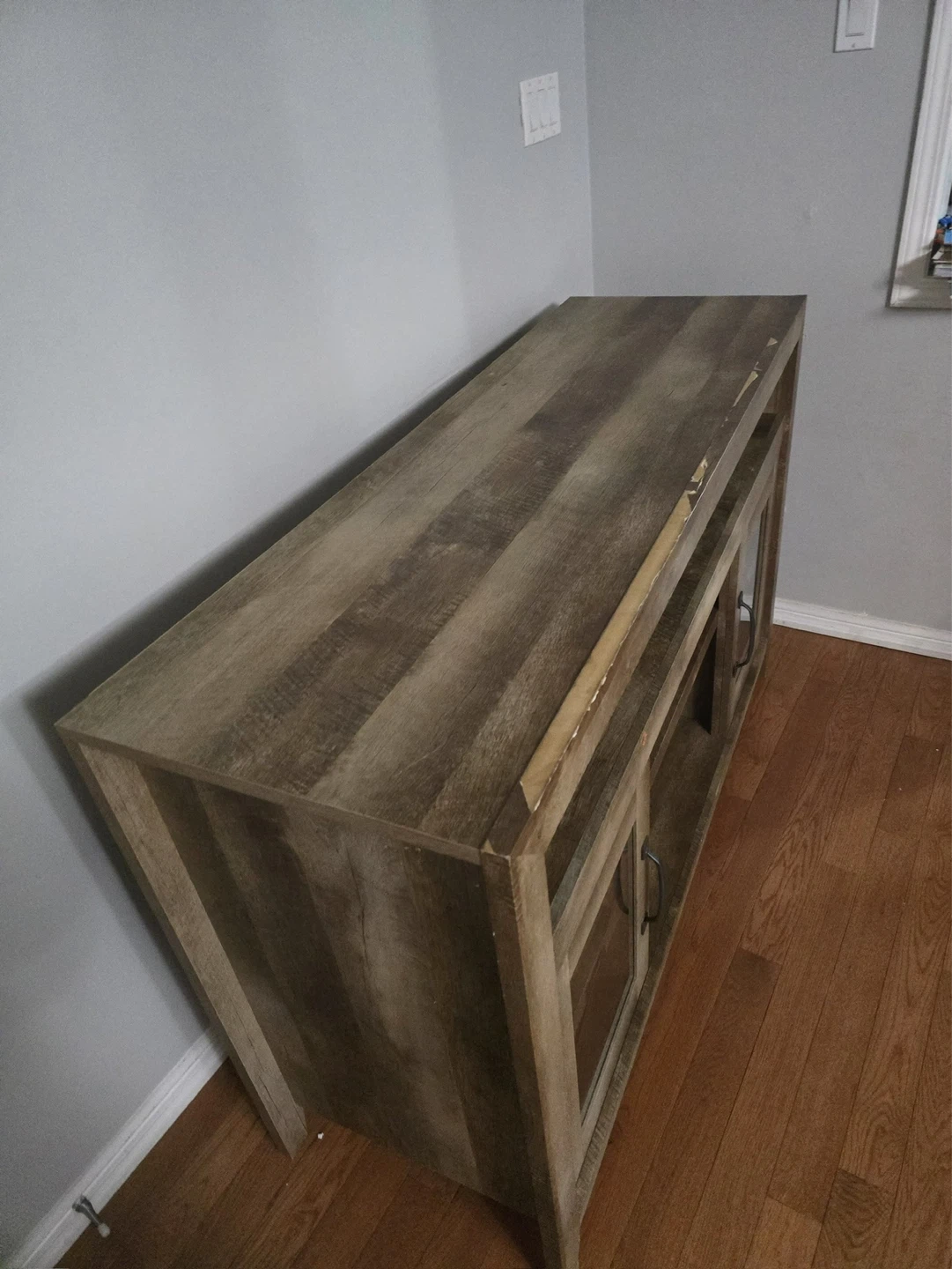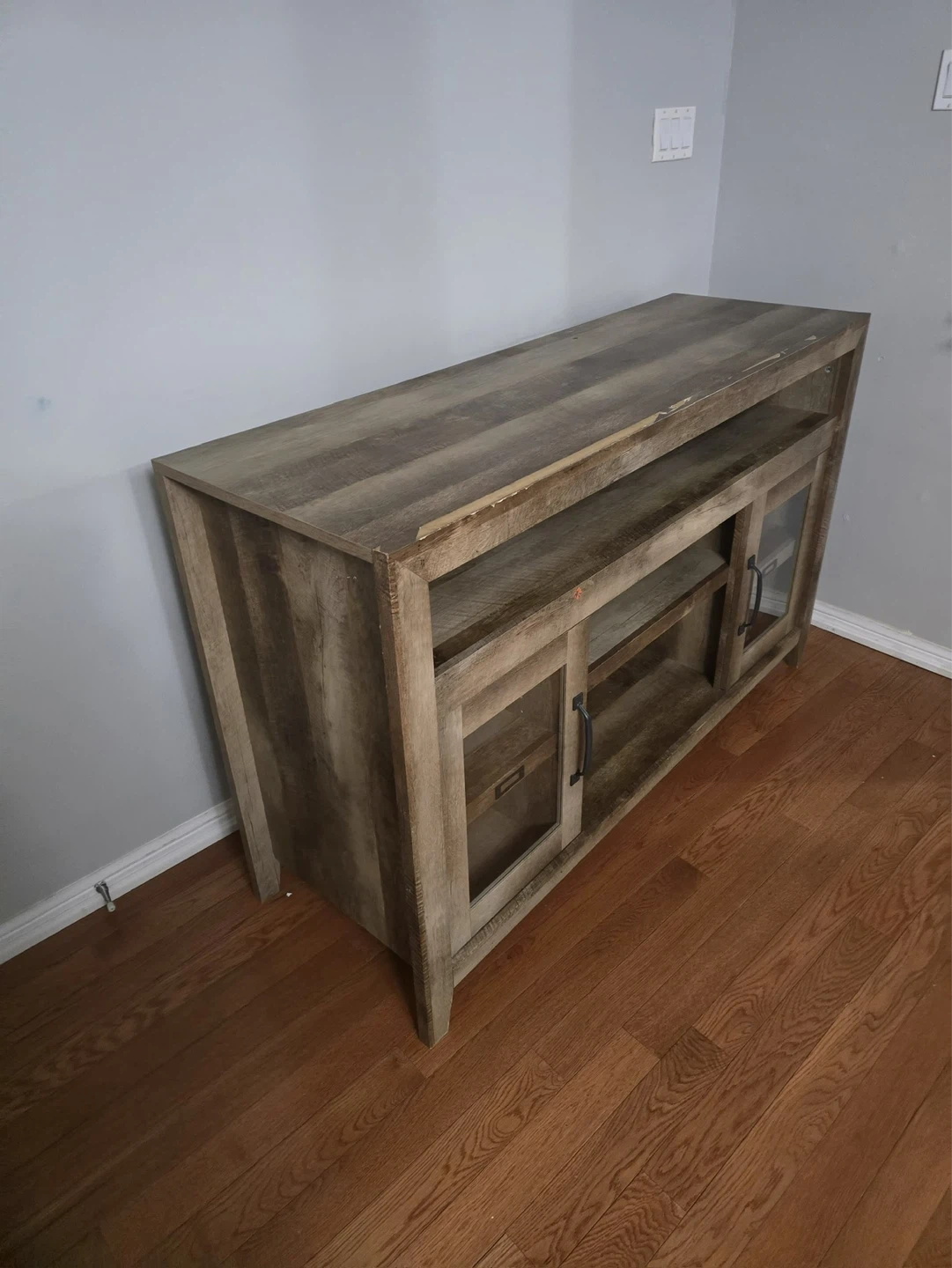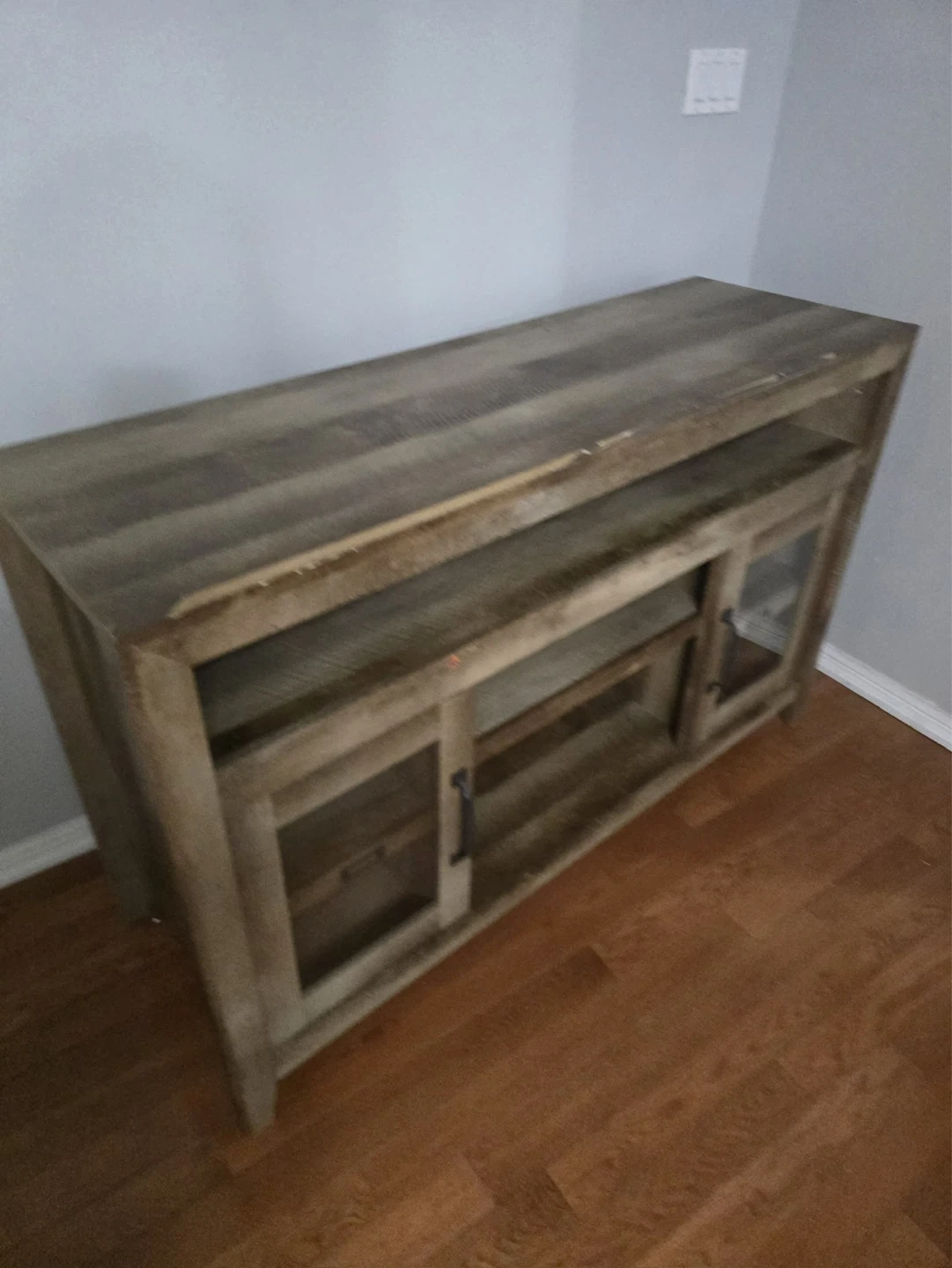 This TV stand features a rustic, distressed wood finish and two glass-fronted cabinets with black handles. It offers ample shelving for media consoles and storage. The top surface is great for displaying decor or your TV. A nice addition to your living room!