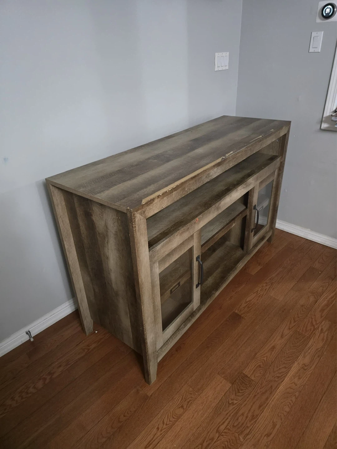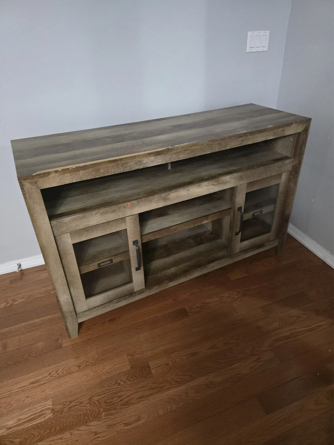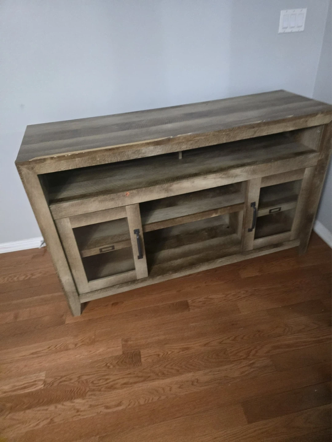 This TV stand features a rustic, distressed wood finish and two glass-fronted cabinets with black handles. It offers ample shelving for media consoles and storage. The top surface is great for displaying decor or your TV. A nice addition to your living room!