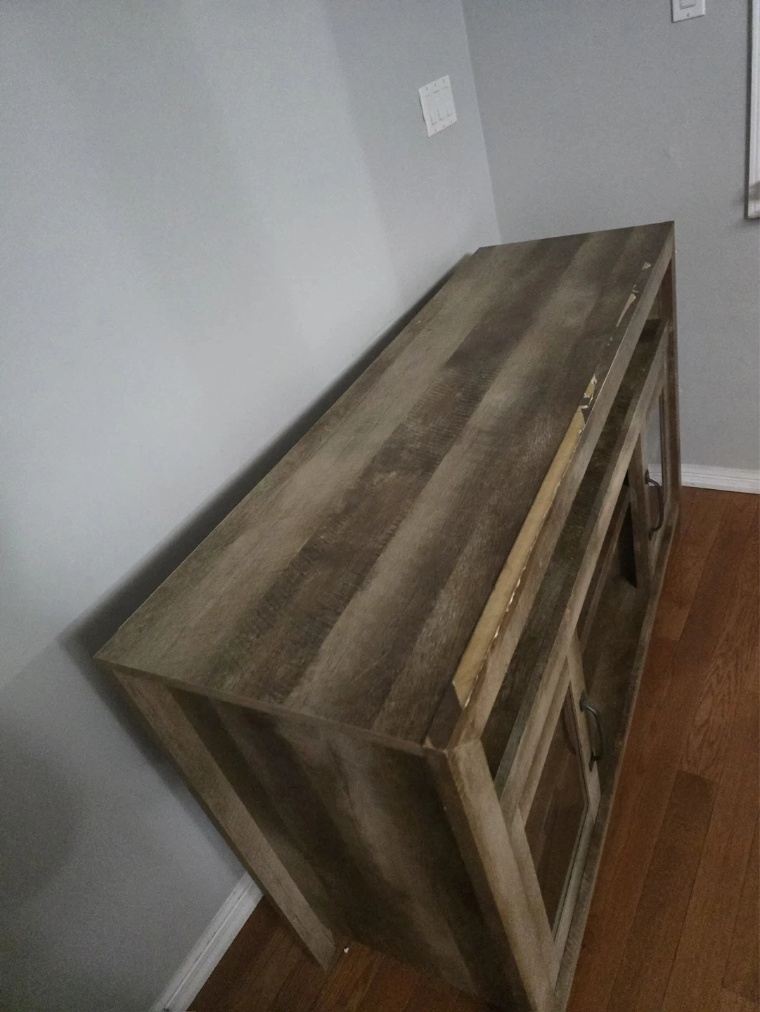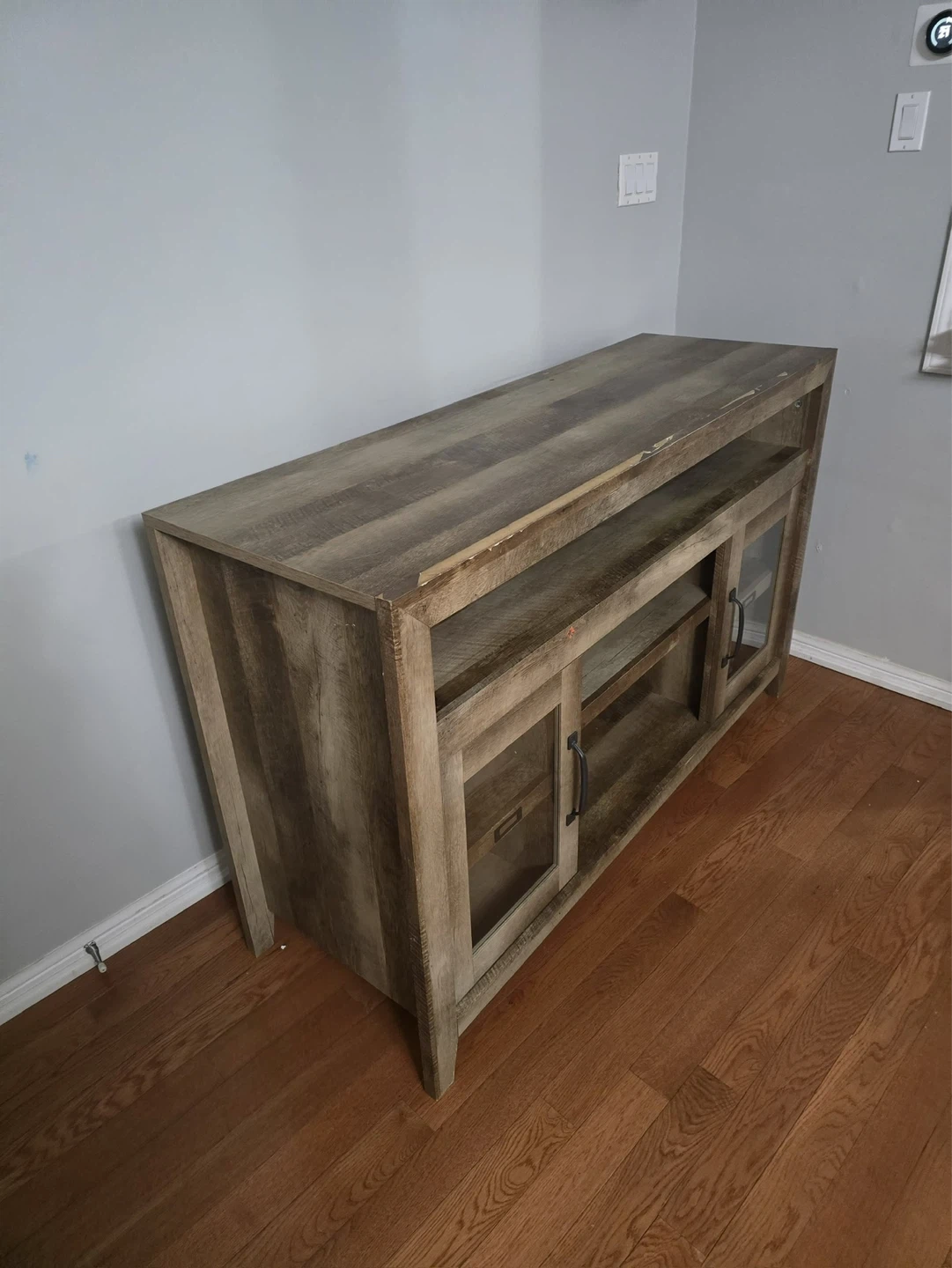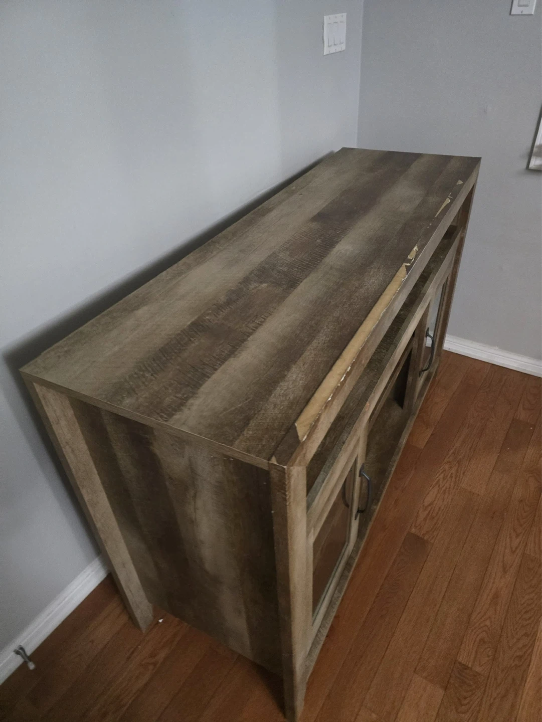 This TV stand features a rustic, distressed wood finish and two glass-fronted cabinets with black handles. It offers ample shelving for media consoles and storage. The top surface is great for displaying decor or your TV. A nice addition to your living room!