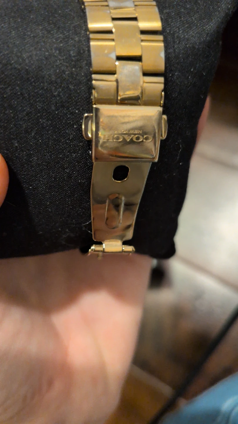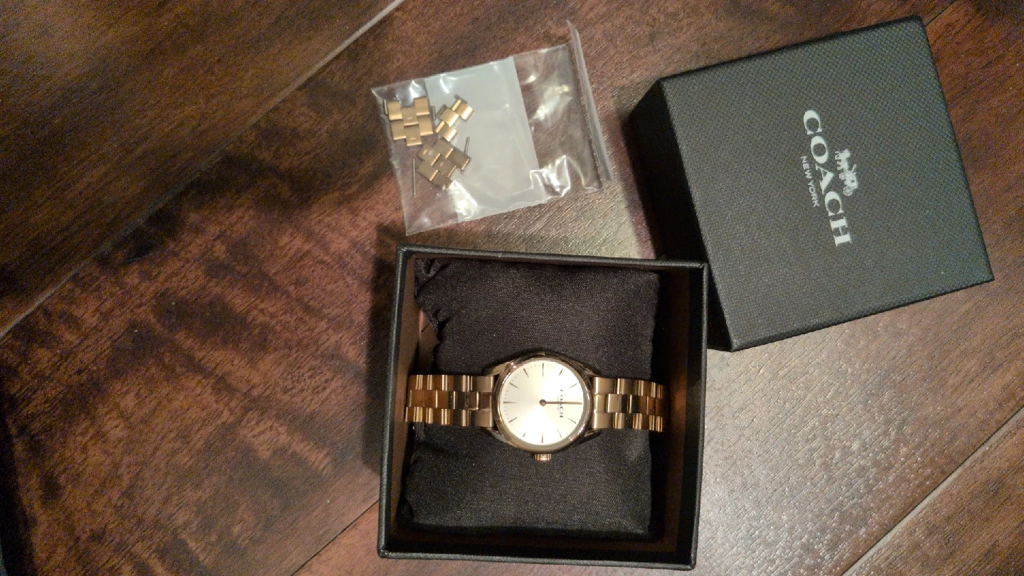 Selling a Coach women's watch in gold-tone. It comes with its original box and includes extra links. There are some signs of wear, as shown in the photos, but they are barely noticeable. Needs a battery change.