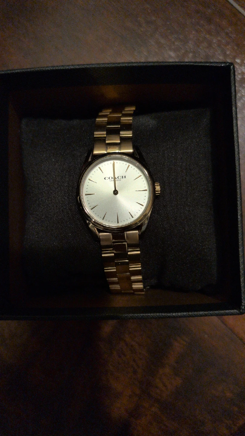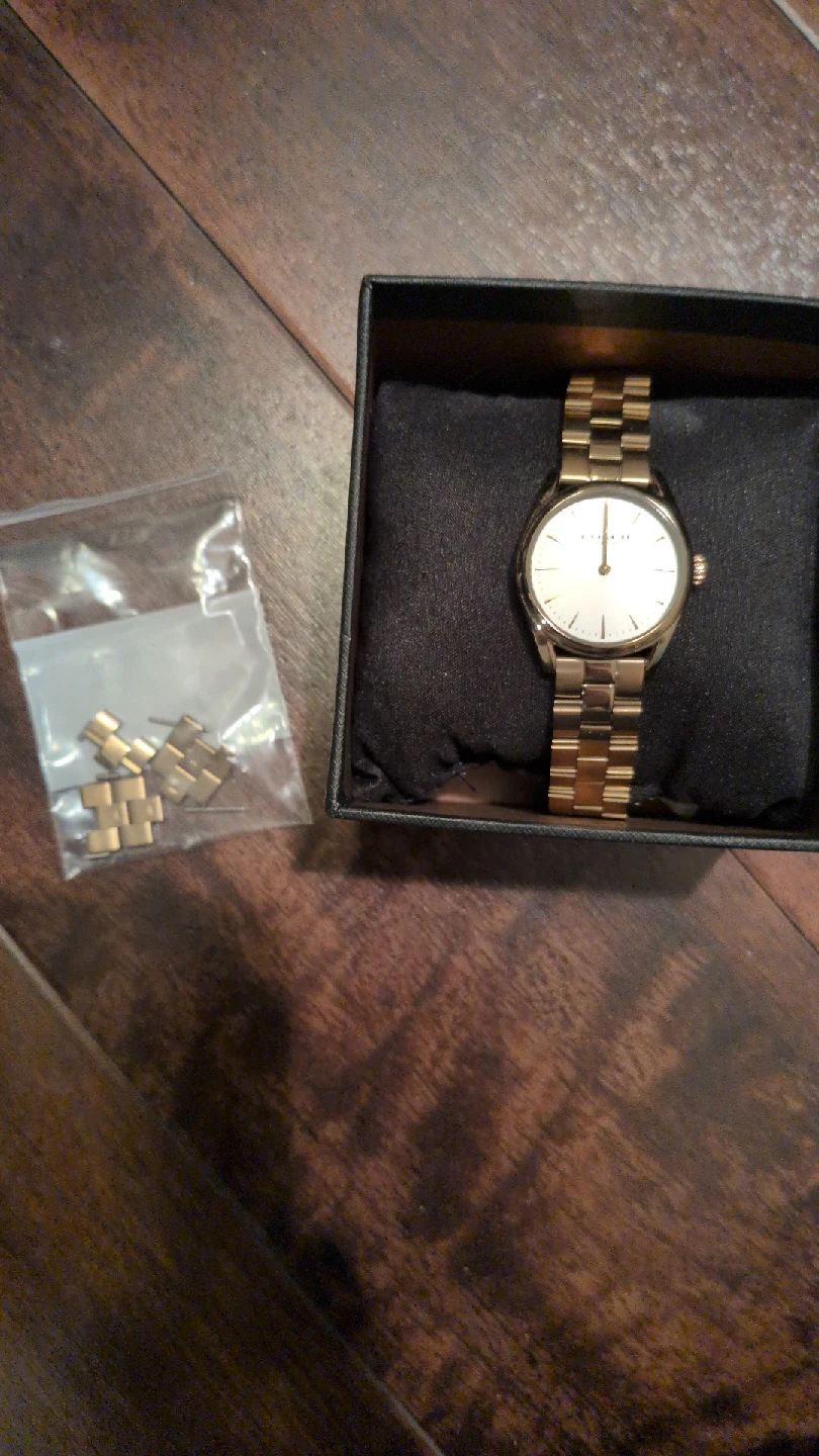 Selling a Coach women's watch in gold-tone. It comes with its original box and includes extra links. There are some signs of wear, as shown in the photos, but they are barely noticeable. Needs a battery change.