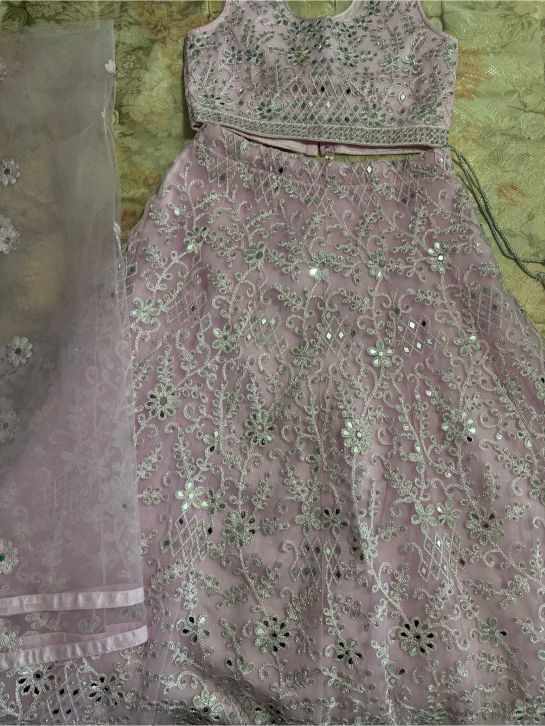 This is a beautiful pink lehenga choli set with intricate embroidery and mirror work. It comes with a matching dupatta. Perfect for special occasions and festive events!