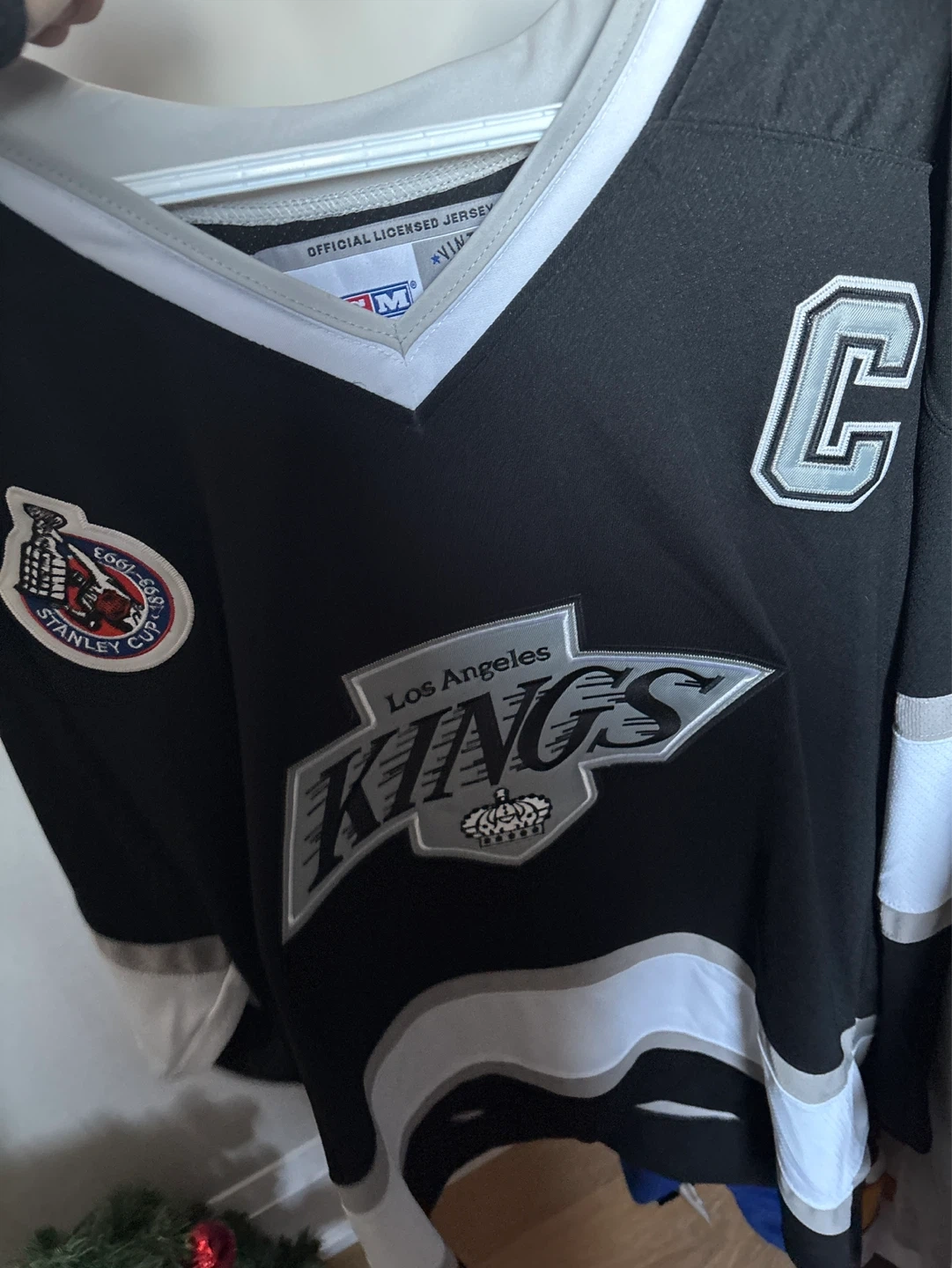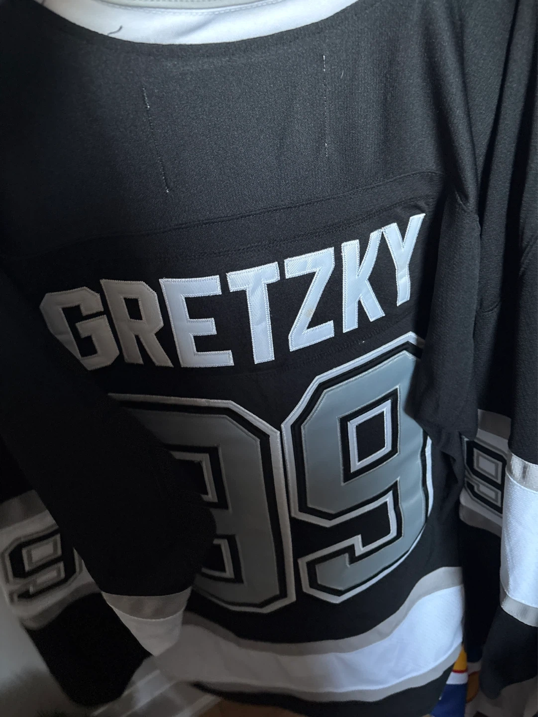 This is an officially licensed Los Angeles Kings hockey jersey featuring Wayne Gretzky's name and number 99. It has the Los Angeles Kings logo on the front and a Stanley Cup patch. It's black with grey and white accents.