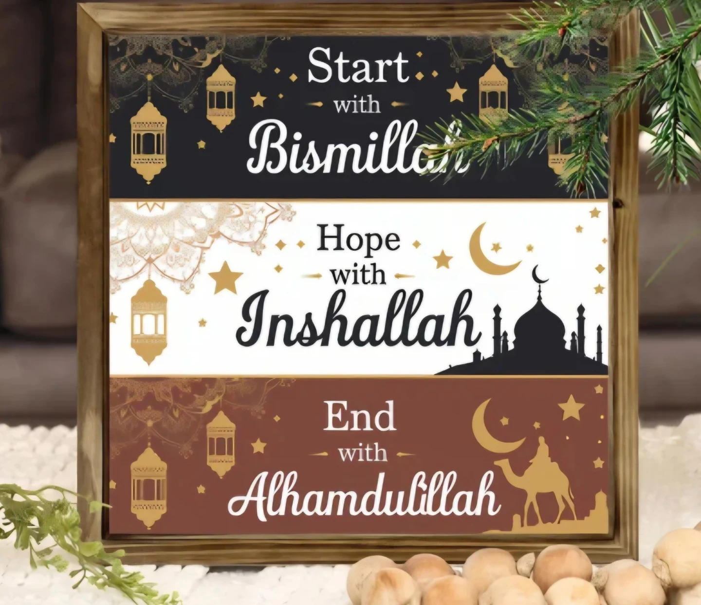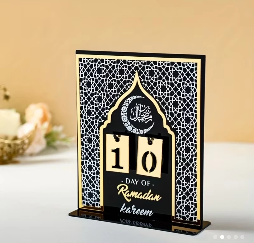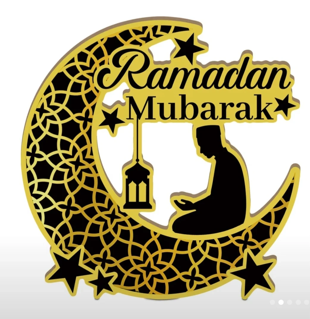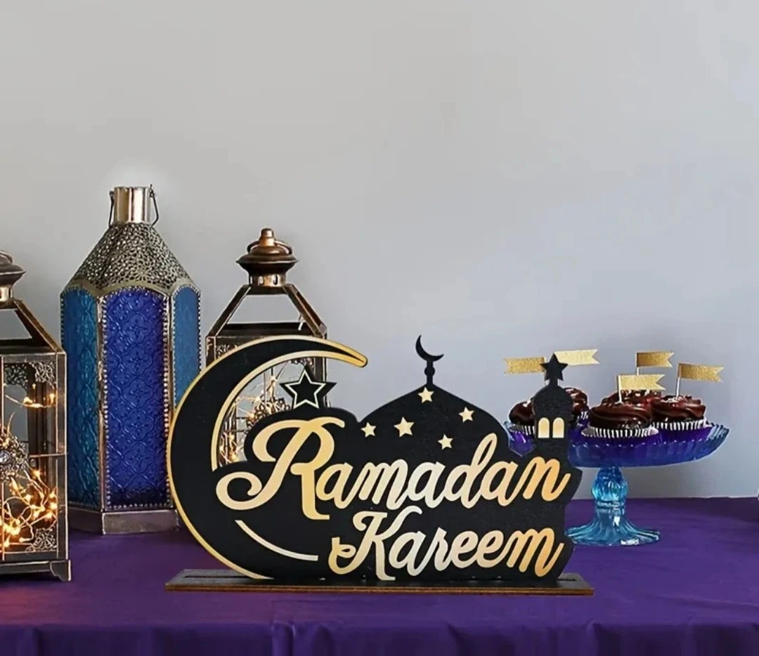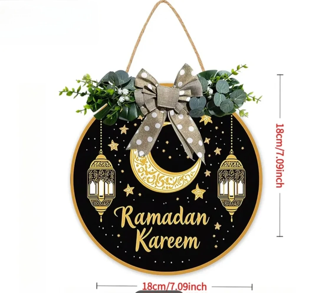 This Ramadan Kareem hanging decor features a crescent moon with lanterns and floral accents. A lovely addition for your Ramadan celebrations!