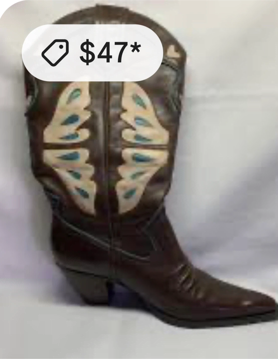 Stylish brown leather cowboy boots. They feature a cream and turquoise butterfly design on the shaft. These boots have a pointed toe and a stacked heel.