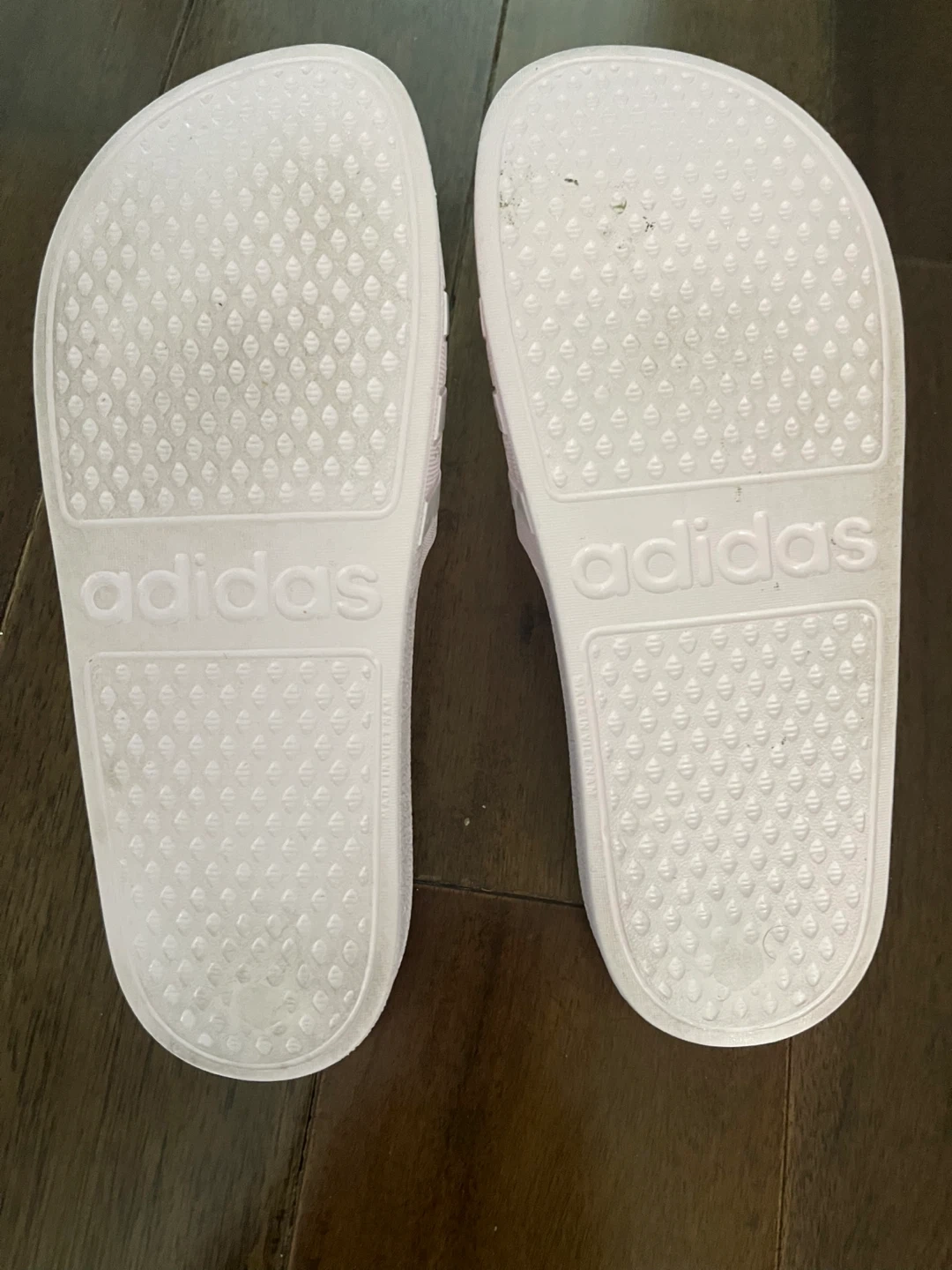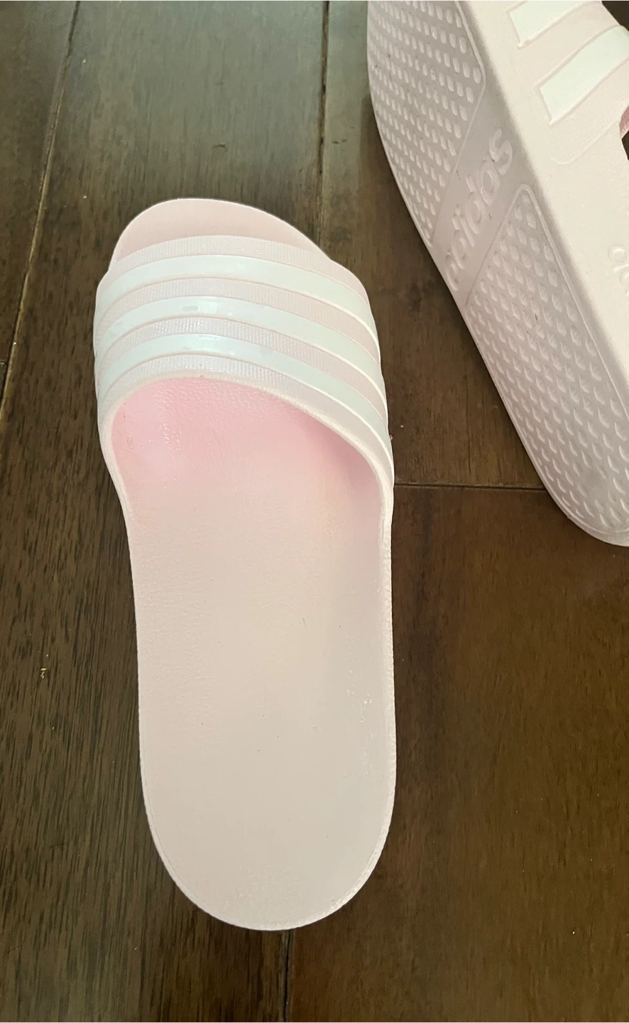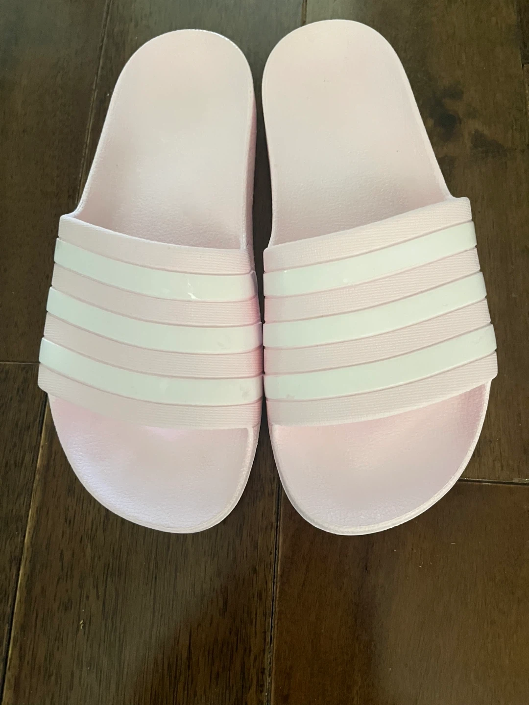 These pink Adidas slides are a size medium. They feature the classic three-stripe design. Perfect for lounging or quick errands!