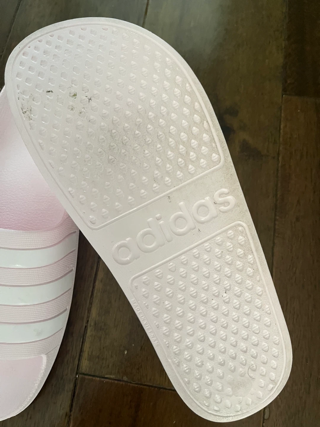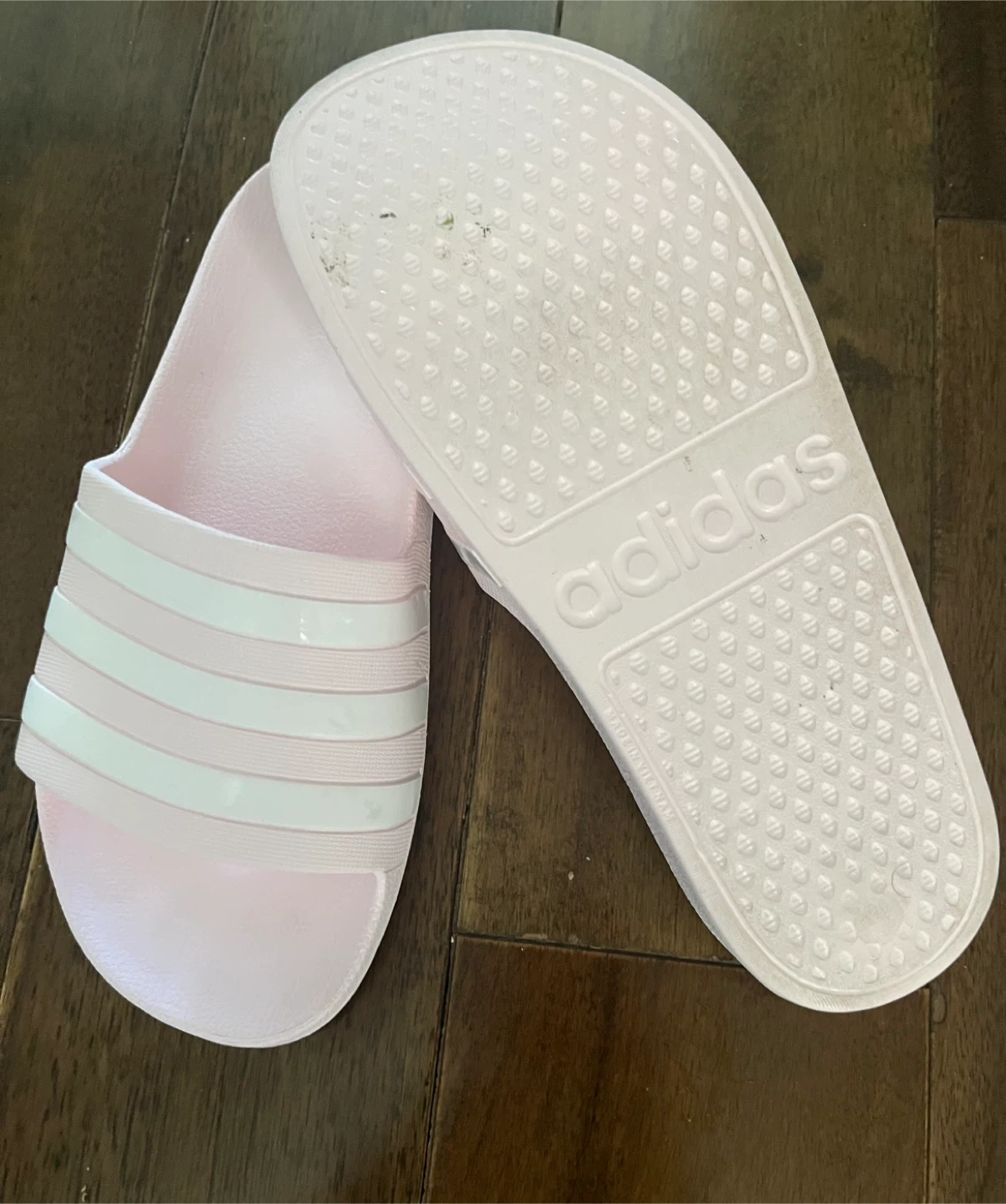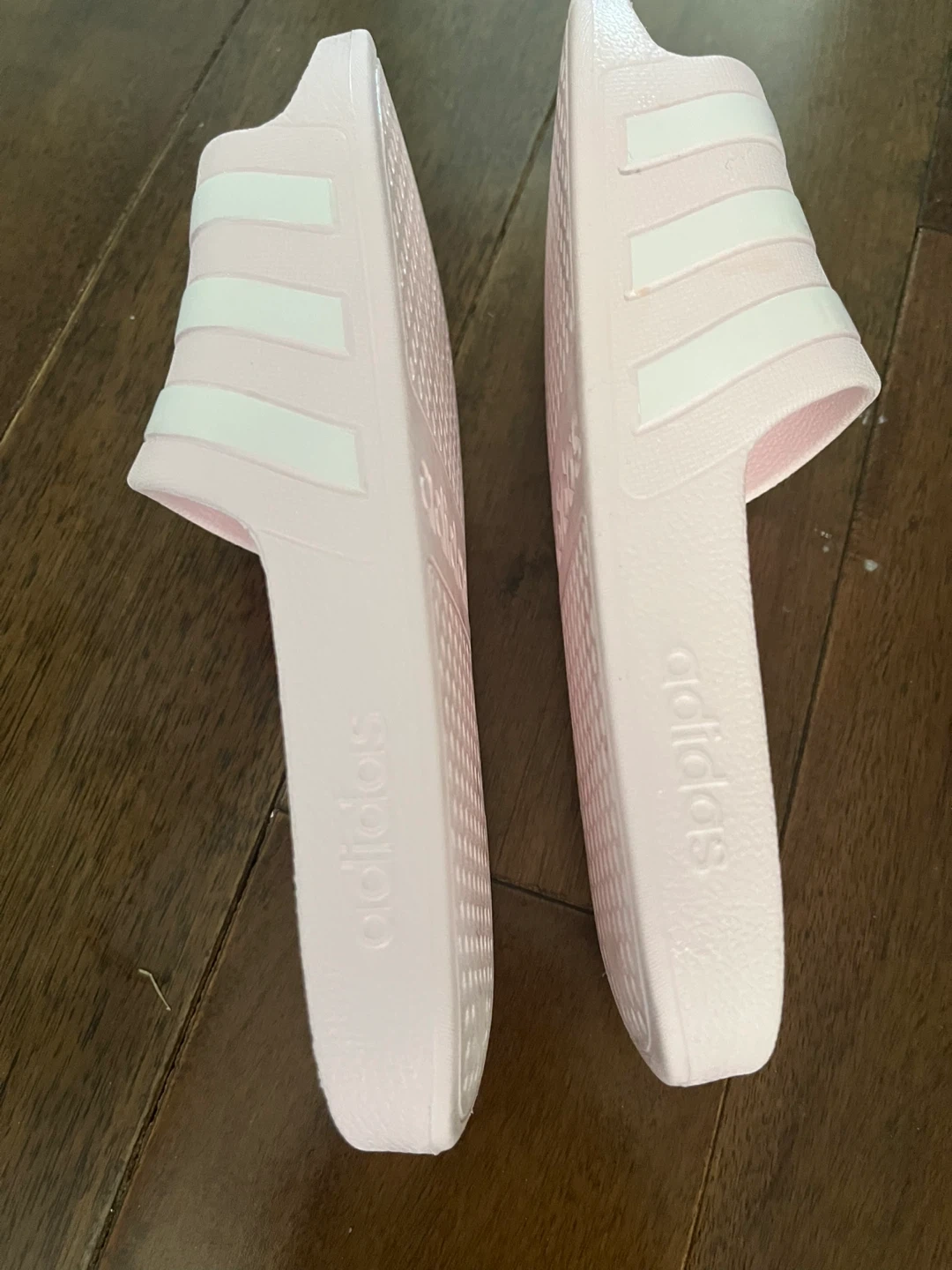 These pink Adidas slides are a size medium. They feature the classic three-stripe design. Perfect for lounging or quick errands!
