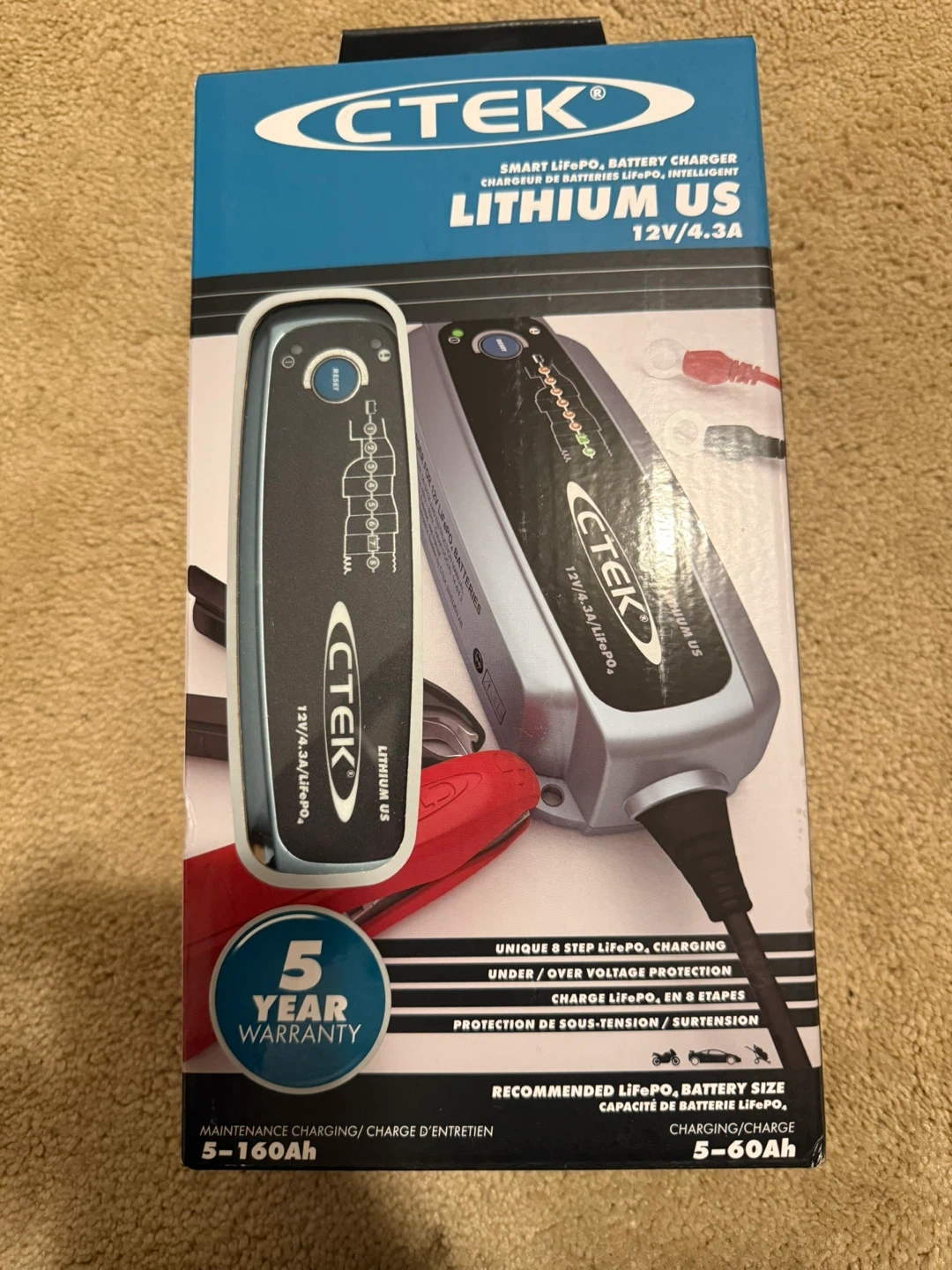 Selling a brand new CTEK Lithium US 12V/4.3A smart LiFePO₄ battery charger! It's intelligent and designed to charge lithium batteries. - Unique 8 step LiFePO₄ charging - Under/over voltage protection - Maintenance charging - Suitable for 5-160Ah batteries - Comes with CTEK charger, connect clamps, comfort connect, and storage bag