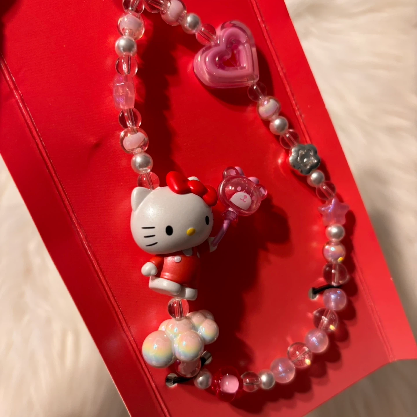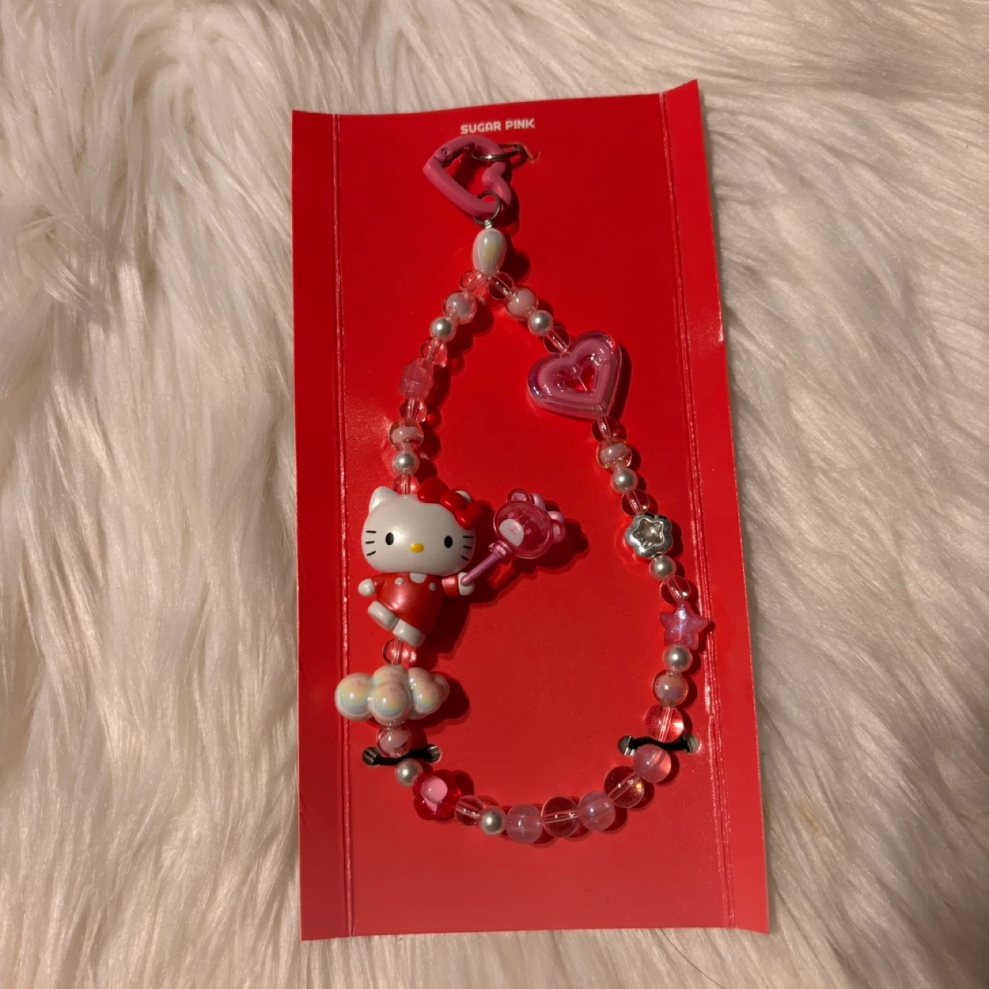 Cute Hello Kitty cellphone strap in a sweet sugar pink colour! Features Hello Kitty charm, hearts, and star beads. Perfect for adding a bit of kawaii to your outfit