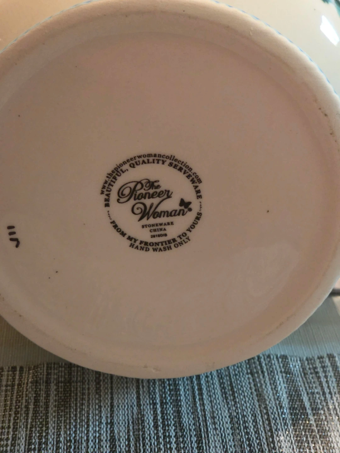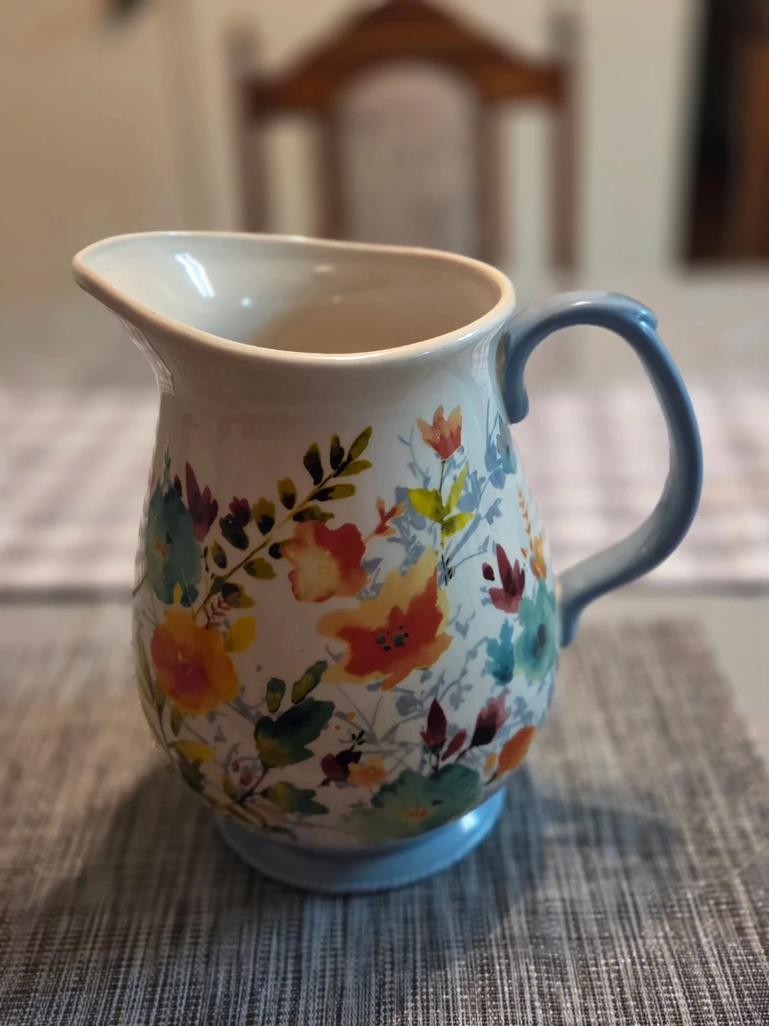 This is a beautiful stoneware pitcher from The Pioneer Woman Collection. It features a lovely floral pattern and a light blue handle and base. Hand wash only.