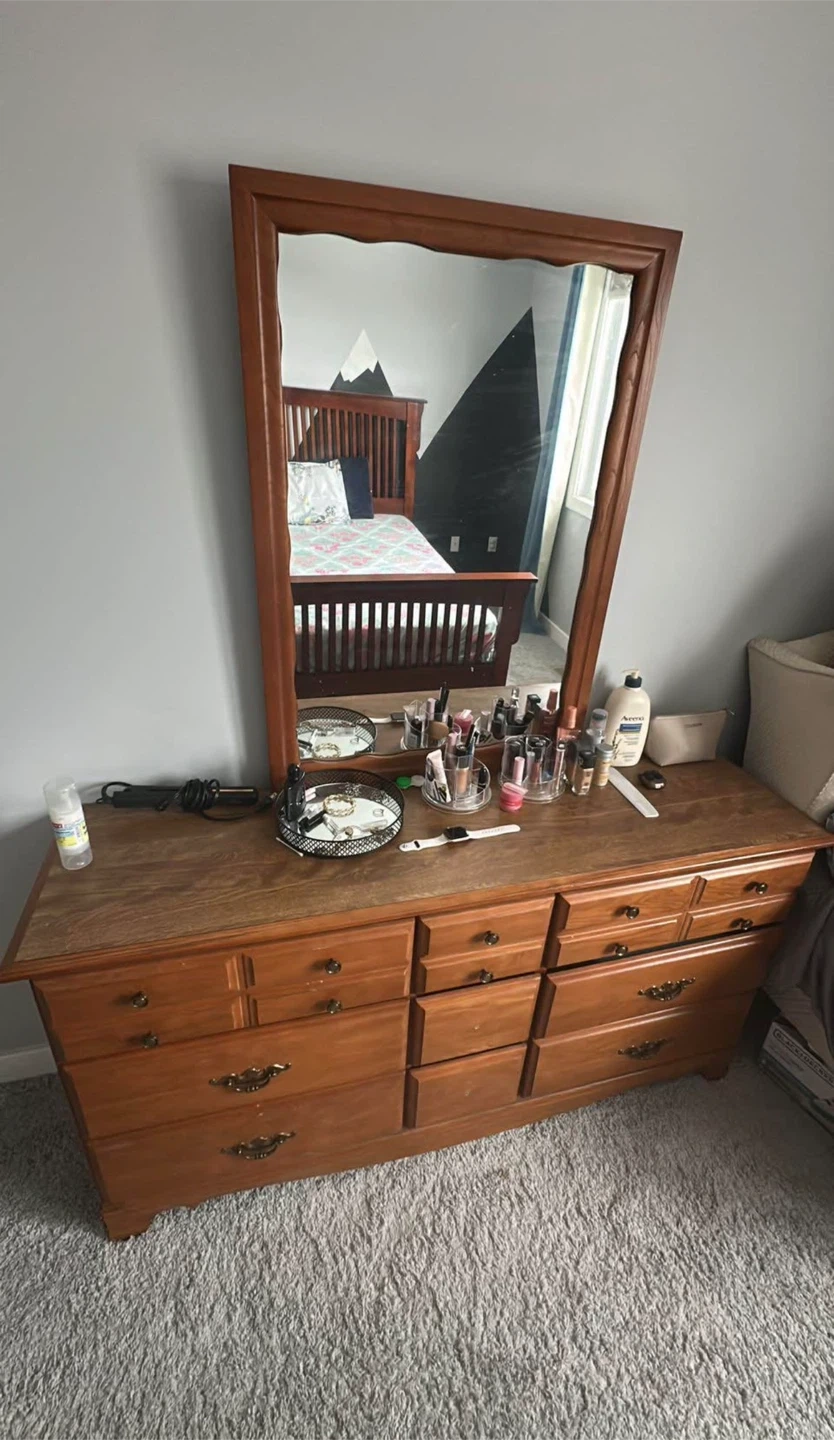 Beautiful solid wood vanity/dresser with a large mirror and multiple drawers for lots of storage. Very sturdy, clean, and in great condition. Perfect for makeup or bedroom use.