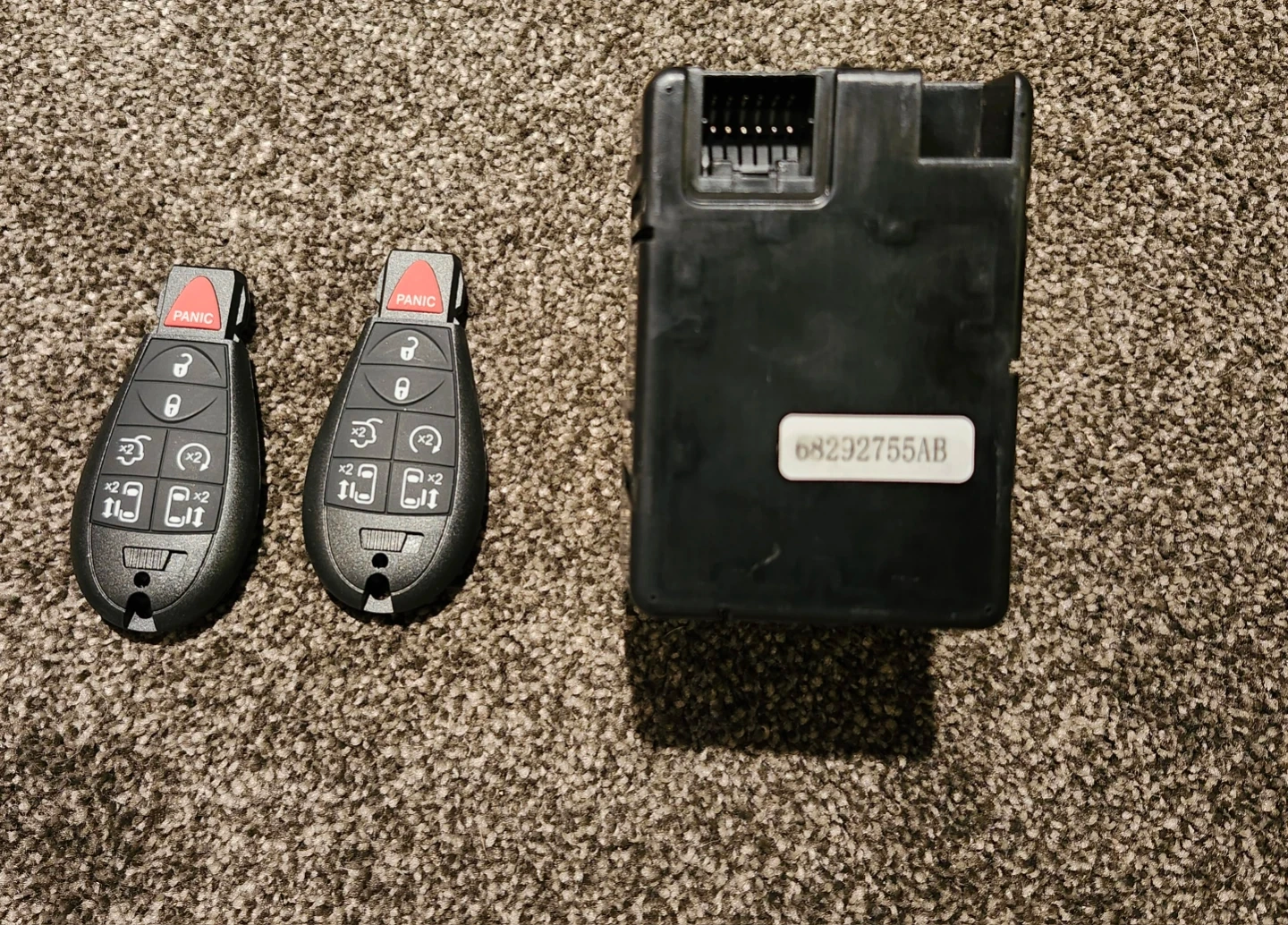 Ignition switch node and two key fobs. Compatible with 2008-2010 Chrysler 300, 2008-2010 Dodge Challenger, 2008-2010 Dodge Charger, and 2009-2010 Dodge Magnum. Part numbers include 68292755AB and P68292755AA.