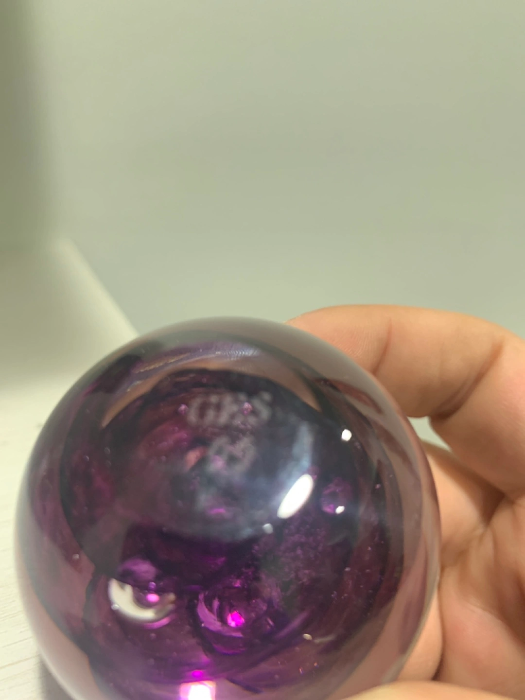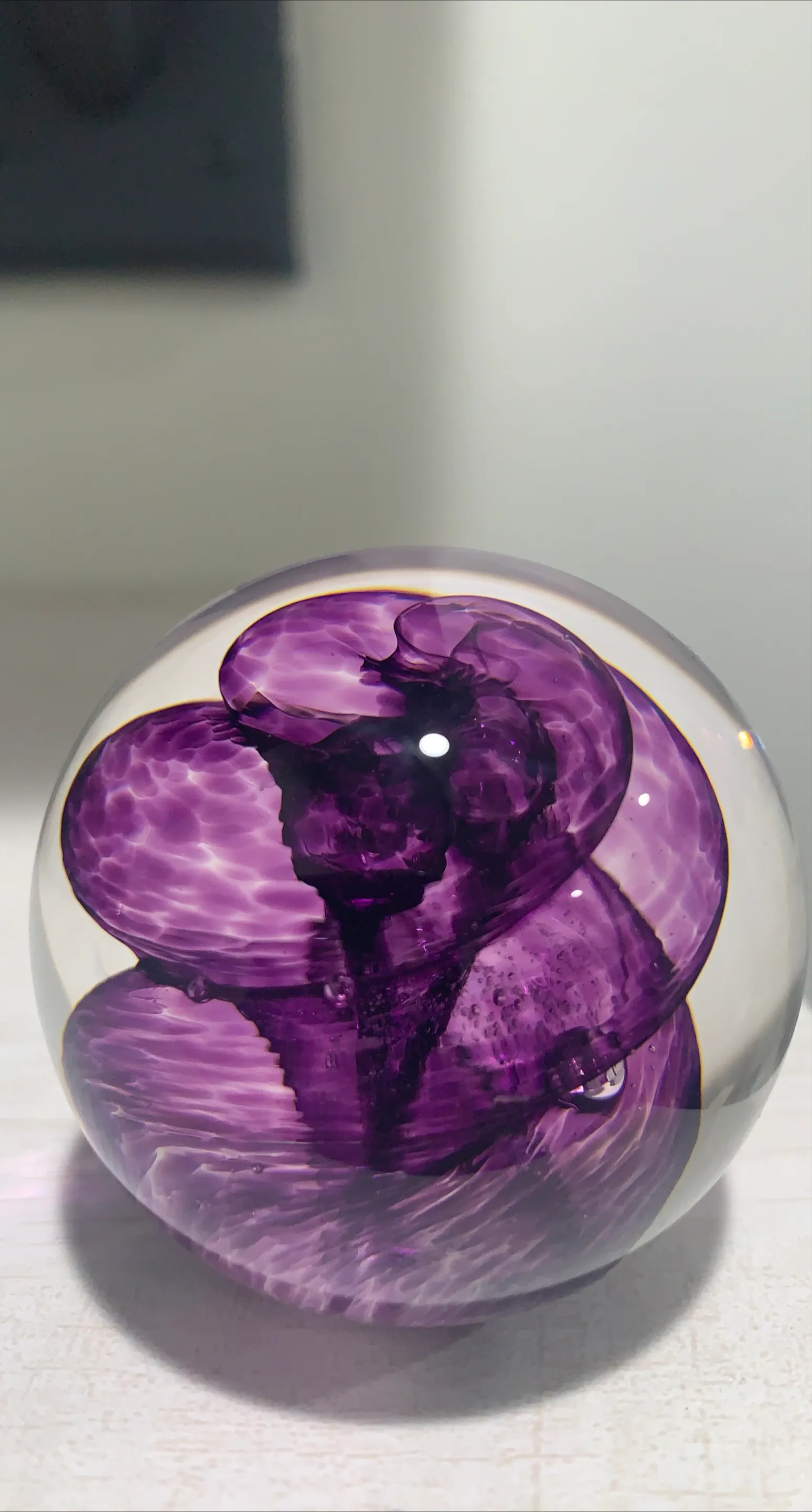 Here's a beautiful purple glass paperweight! It's a great addition to any desk or shelf. The intricate design inside the glass is really eye-catching