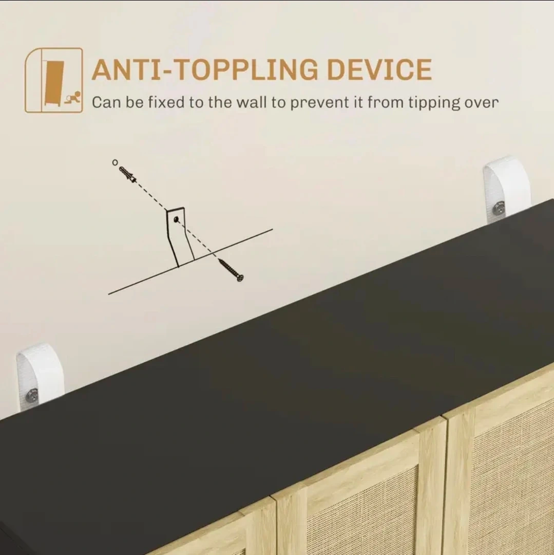 This HOMCOM accent cabinet offers stylish storage with its natural rattan doors and sleek black top and legs. It measures 52.8" wide, 15.7" deep, and 36" high. Includes an anti-toppling device for safety. It's great for a living room or dining area!