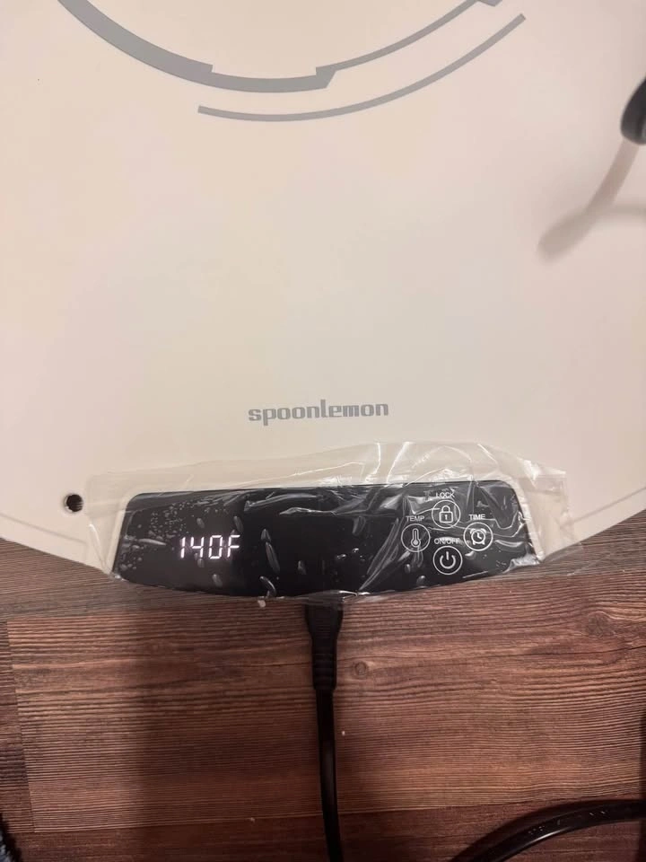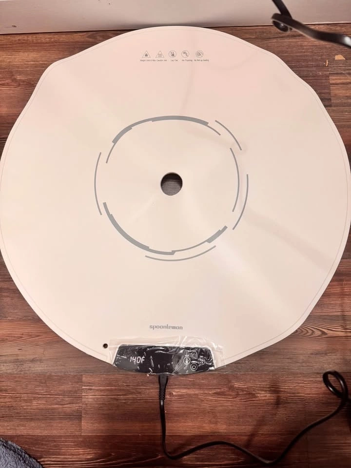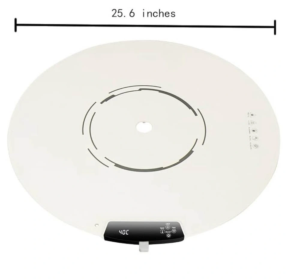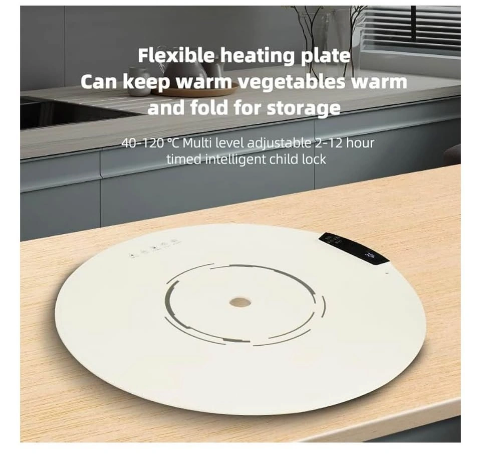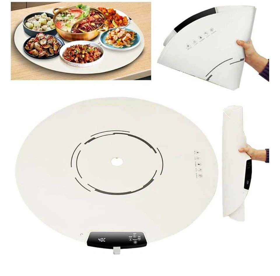 Portable electric round warming tray, foldable & roll up silicone heating mat pad for food. Flexible plate warmer for kitchen, travel, or parties. Features 10-second fast heating and adjustable 9 temperature settings.