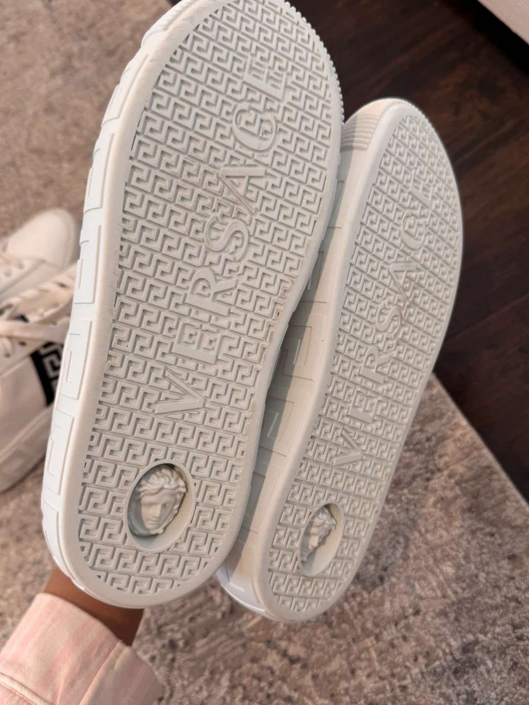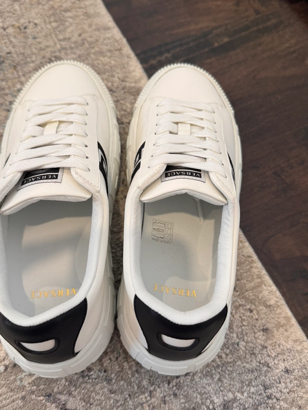 These are white leather Versace sneakers featuring a black Medusa head motif. Brand new