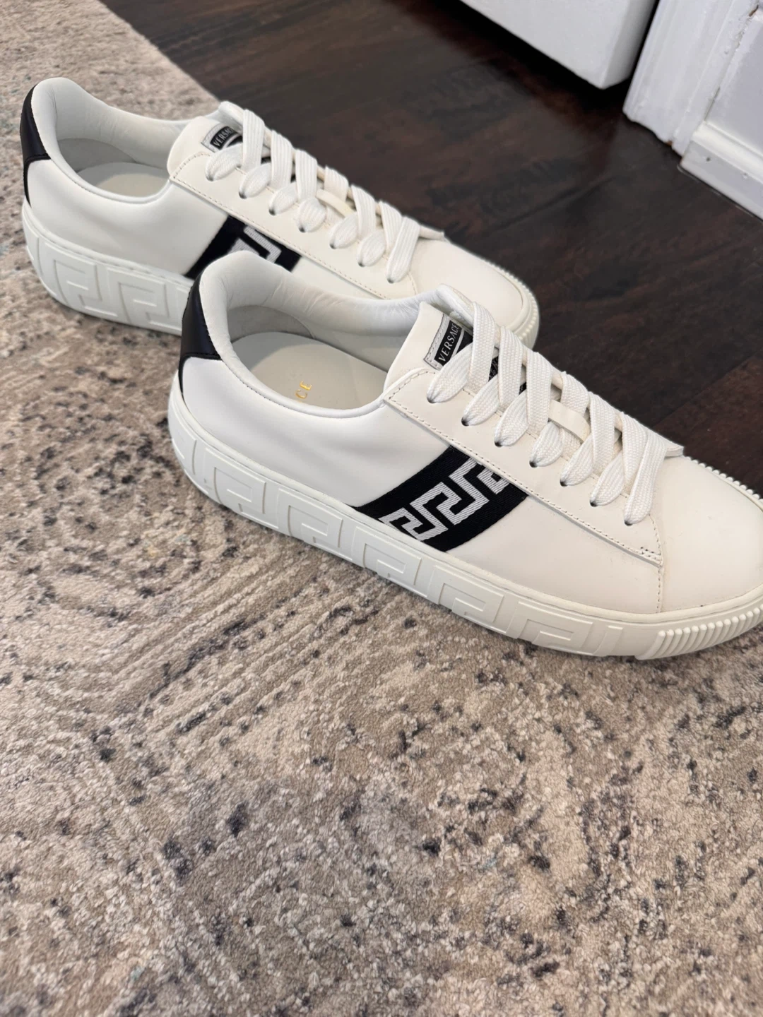 These are white leather Versace sneakers featuring a black Medusa head motif. Brand new