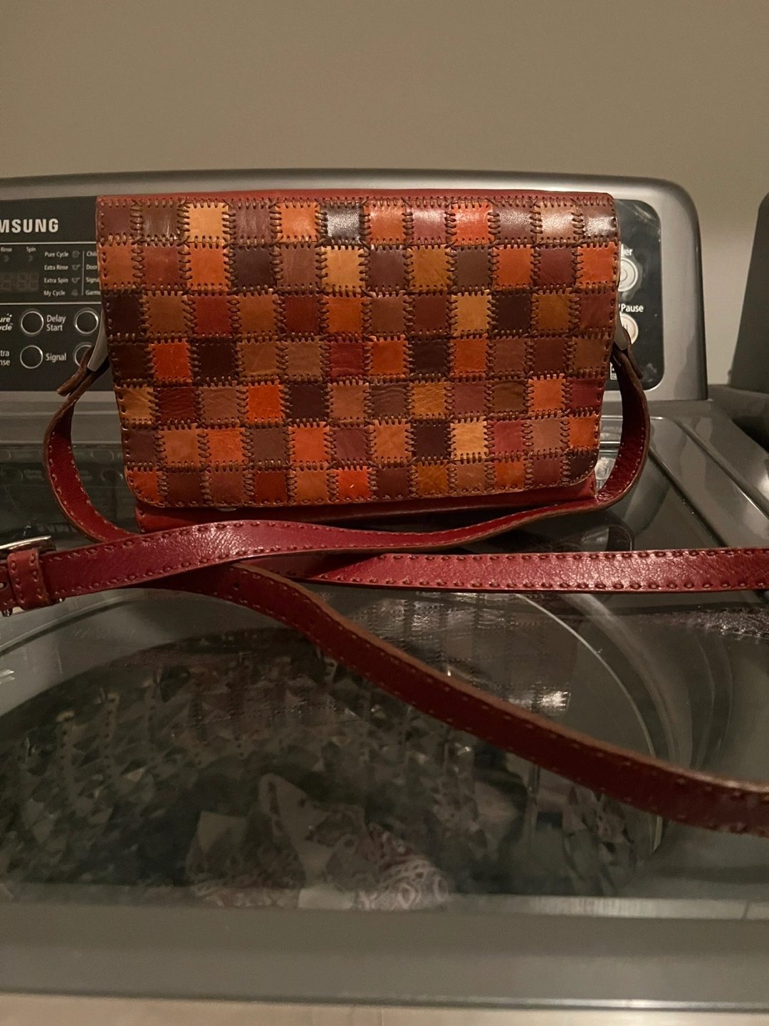 Here's a really unique patchwork leather shoulder bag! It features a cool design with different shades of brown and red leather squares. The strap is adjustable, too