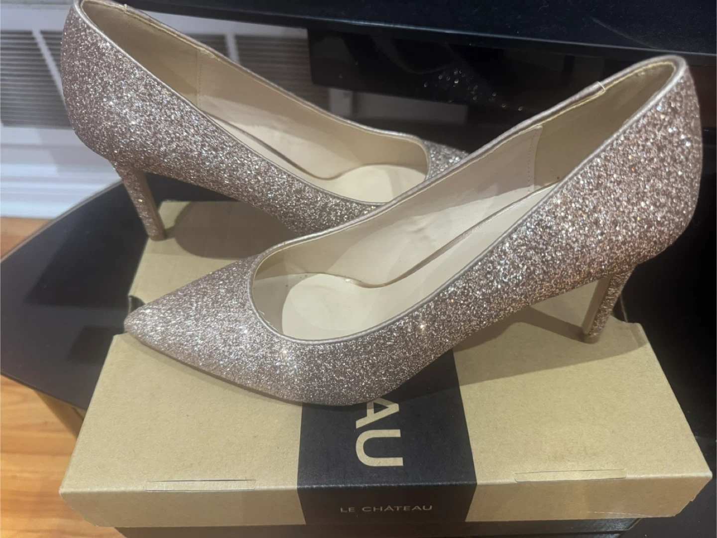 Sparkly rose gold glitter heels from Le Château. These elegant pumps feature a pointed toe and a stiletto heel. Size 40.