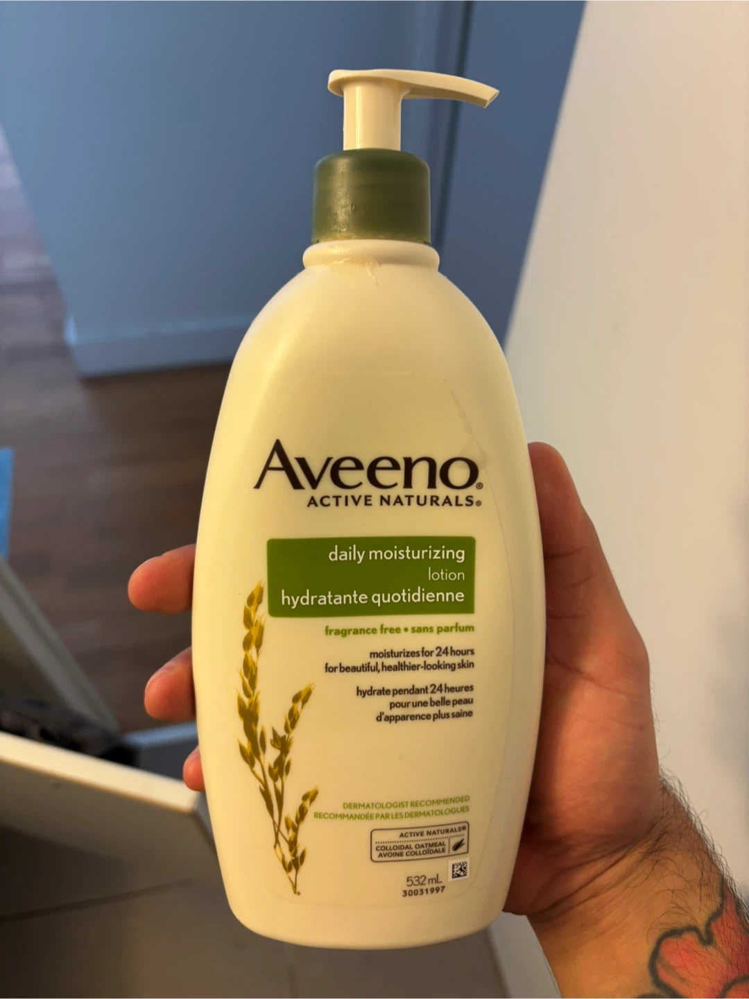 Aveeno Active Naturals daily moisturizing lotion. It's fragrance-free and moisturizes for 24 hours. Made with colloidal oatmeal.